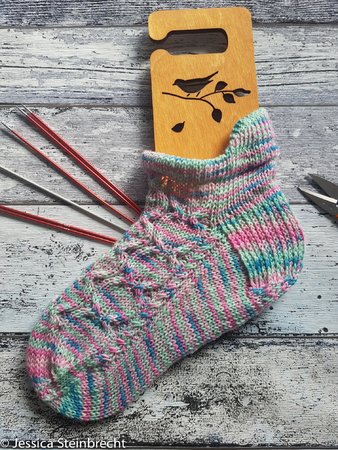 In dieser Anleitung ist das gezeigte erhöhte Bündchen, die Hufeisenferse und die Bandspitze beschrieben. Es kann aber beliebig ausgetauscht werden.