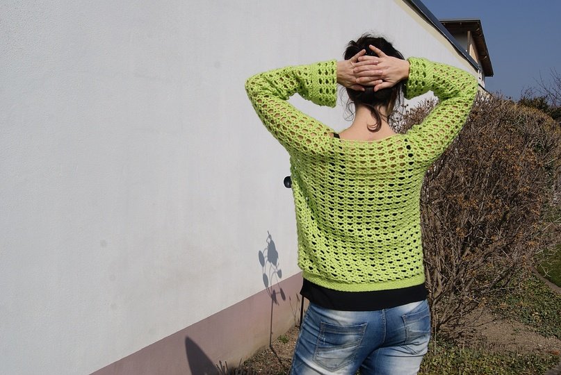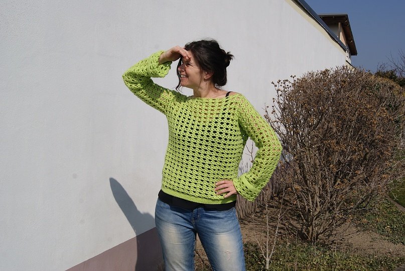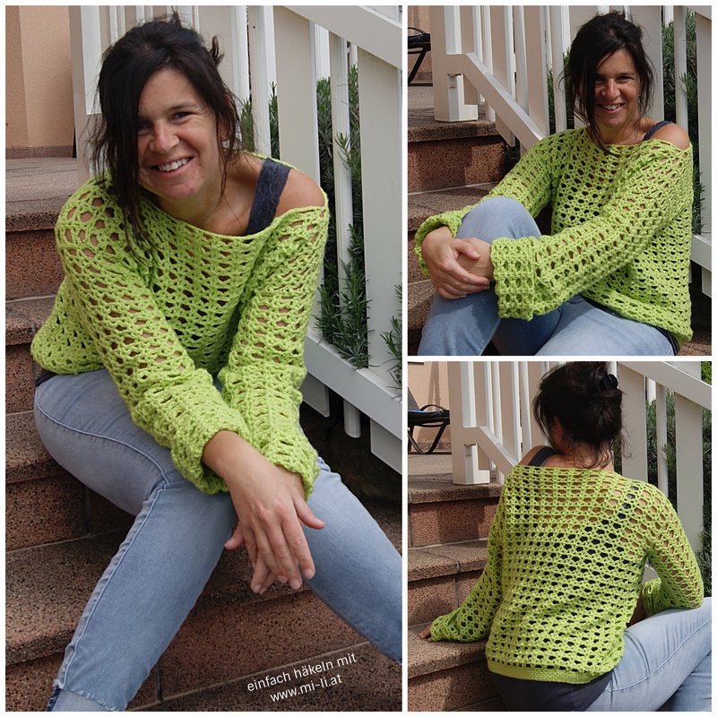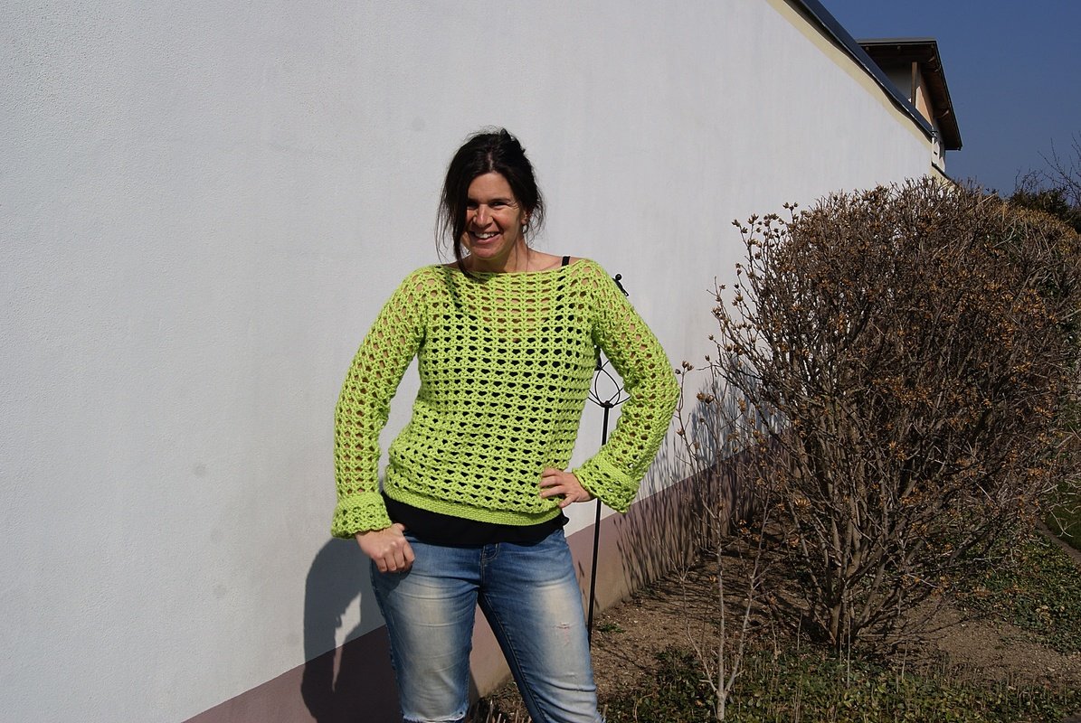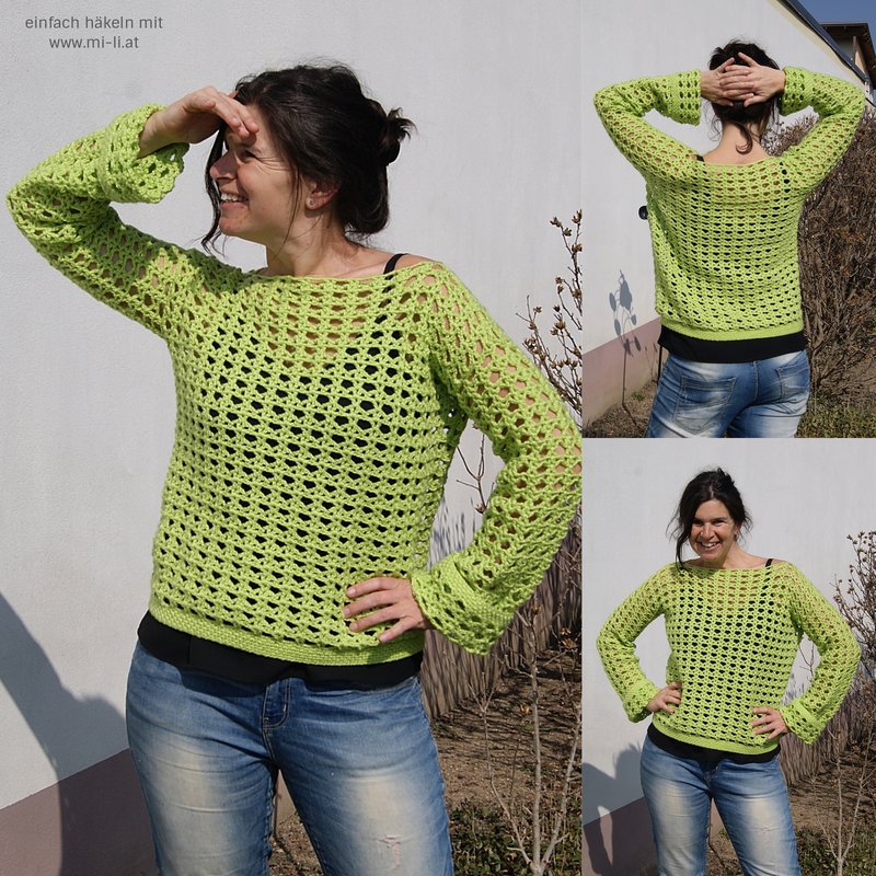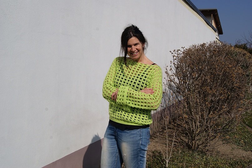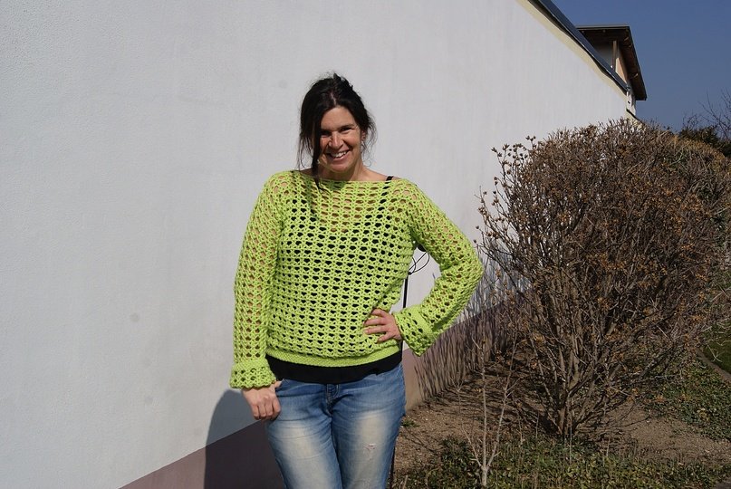 Die Anleitung ist einfach Schritt für Schritt mit Skizze, Maßen und Häkelschriften erklärt, die darunter auch genau Reihe für Reihe in Worten beschrieben ist. Der Pulli ist ganz leicht für alle Größen anzupassen.
