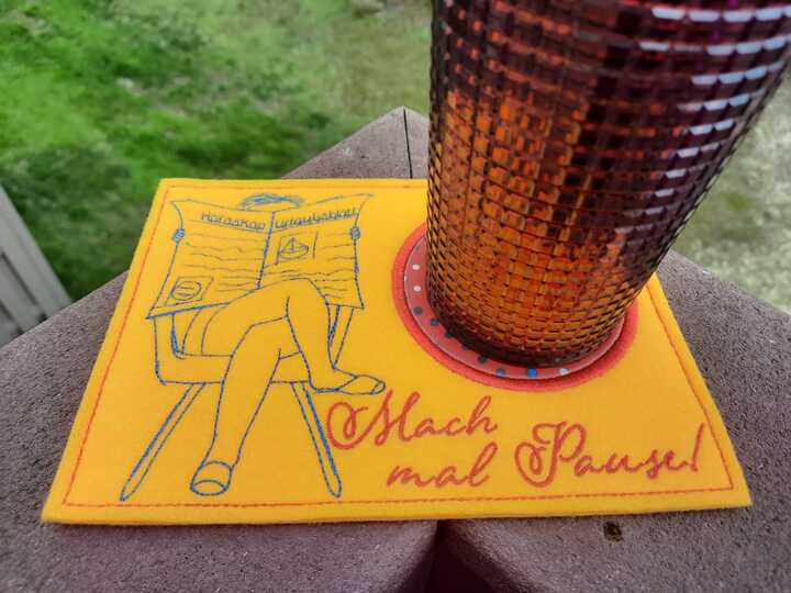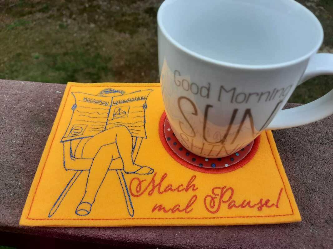 Untersetzer als ITH Stickdatei "Mach mal Pause!" und Applikation rechts für ein Glas oder Tasse.