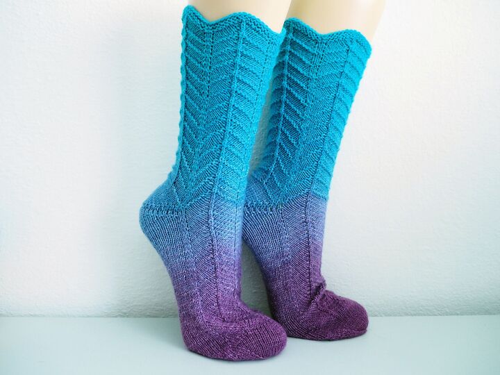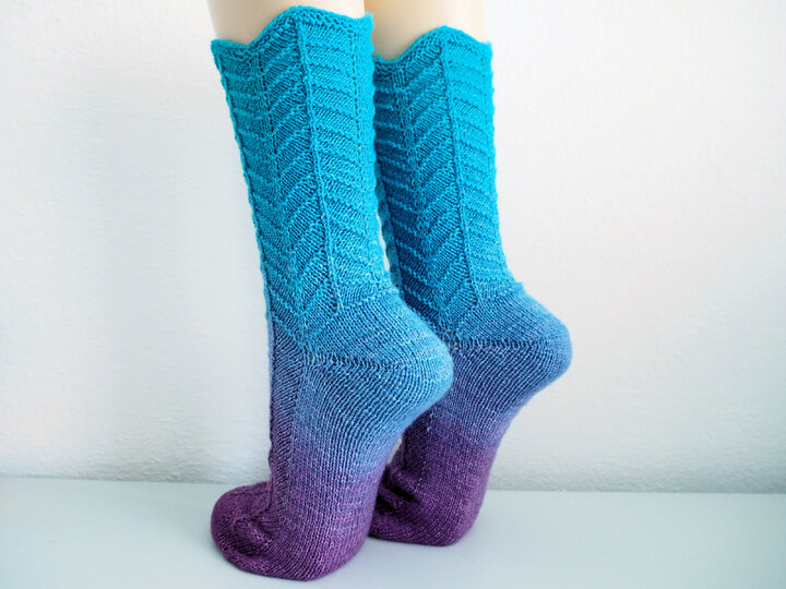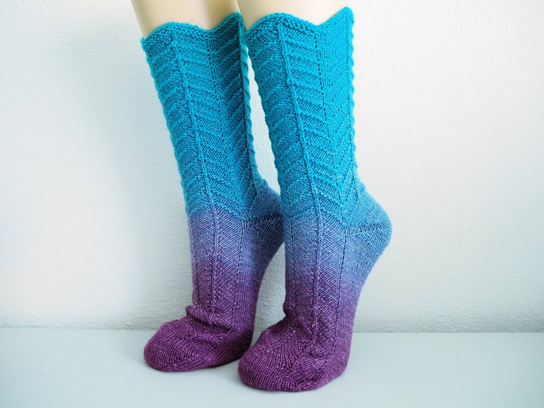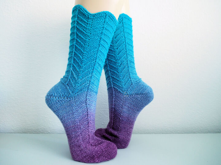 In der Anleitung sind die Bumerangferse und Bandspitze beschrieben aber du kannst auch jede Ferse stricken, die dir gefällt.