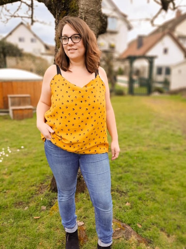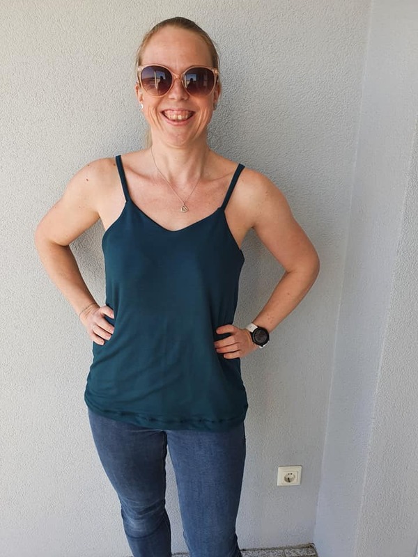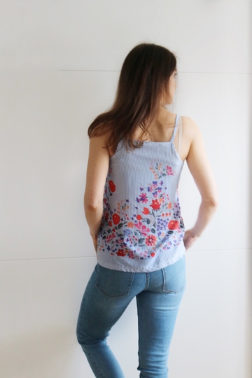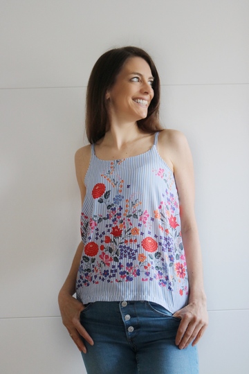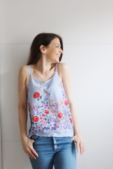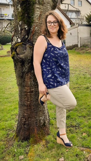 Kala ist ein sommerliches Top, das aus leichten Blusenstoffen genäht wird. Die Träger werden entweder aus dem selben Stoff gearbeitet, oder aus Gummi hinzugefügt. Die Träger werden durch einen über die Brust gehenden Beleg eingefasst, sodass die obere Topkante direkt schön aussieht. Alternativ kannst du Kala auch doppellagig nähen. Kala weist eine leichte A Linie auf und hat 3 vordere Halsausschnitte (hoher und tiefer V-Ausschnitt und Rundhals). Diese können auch für das Rückenteil verwendet werden.