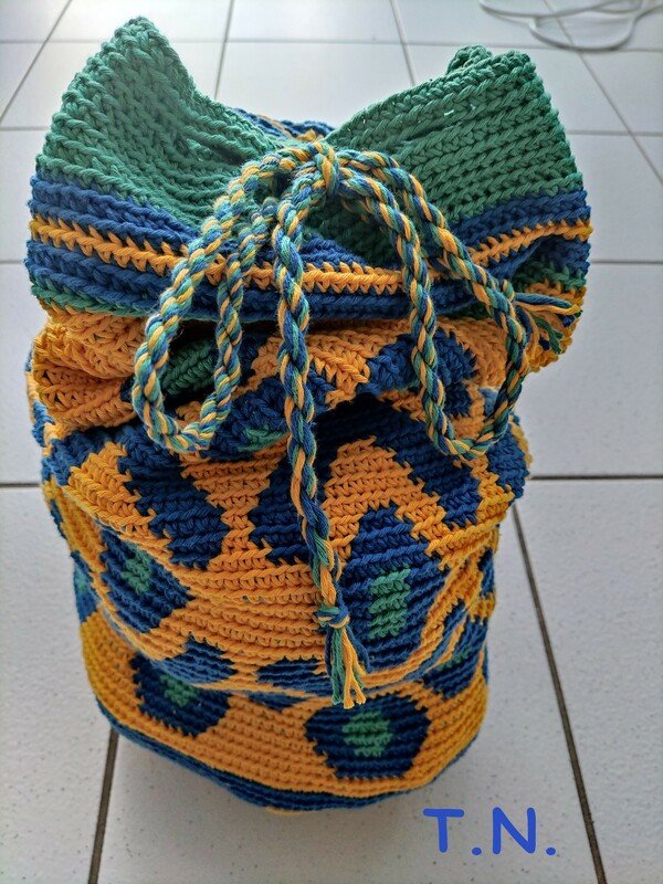 Wir häkeln mit festen Maschen in Spiralrunden. Die Tasche wird mit einem Kordelzug geschlossen und bekommt einen Tragegurt den wir anschließend annähen.