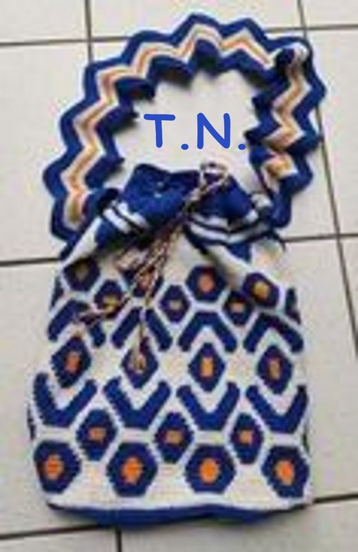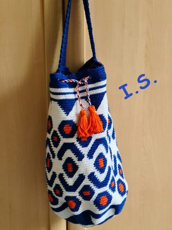 Garn große Tasche: ca. 250g Weiß (oder andere Farbe, ca. 200g Blau (oder andere Farbe), 50g Orange (oder andere Farbe).