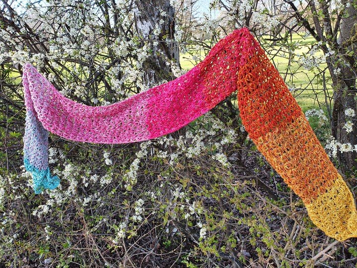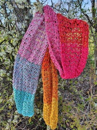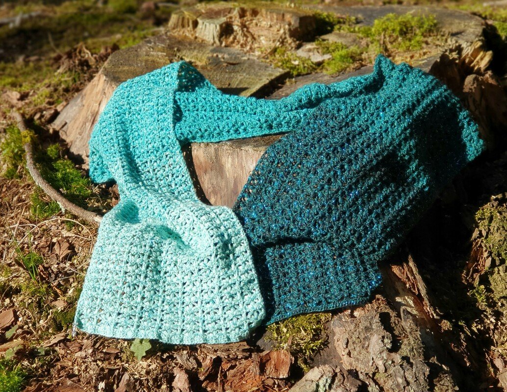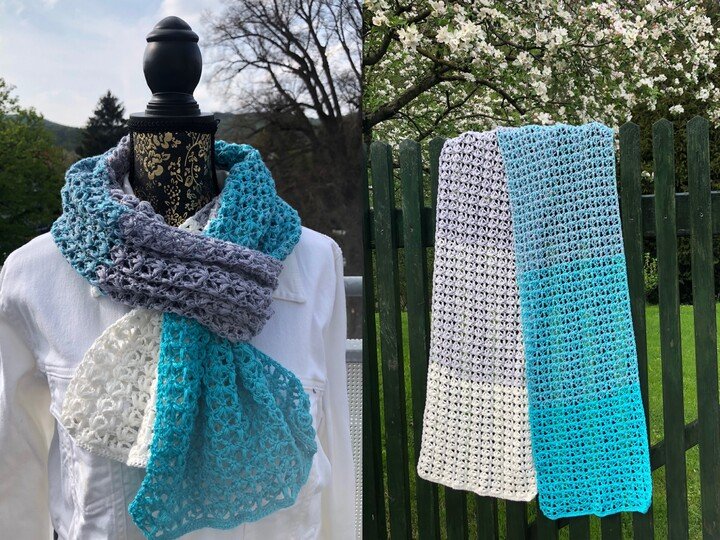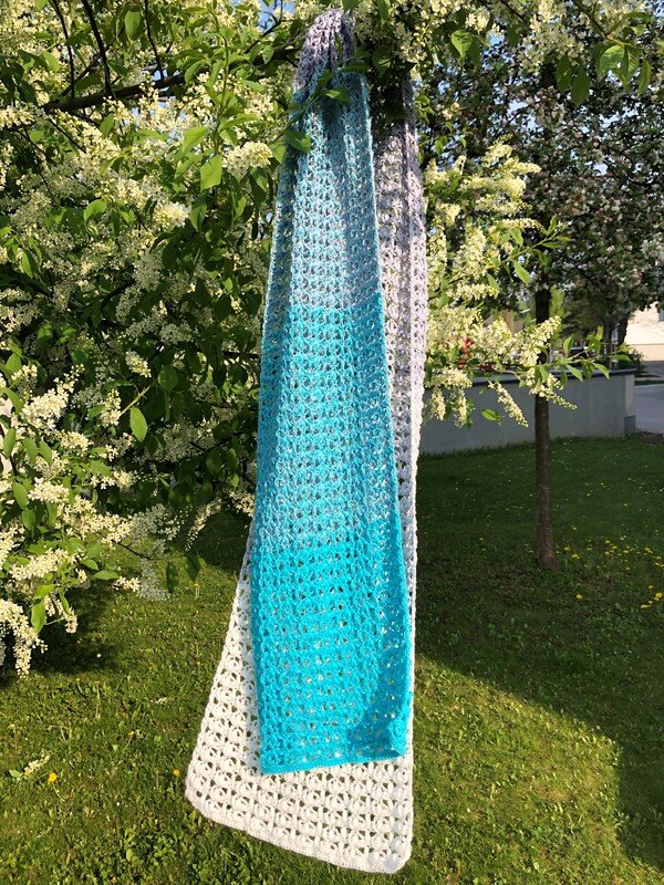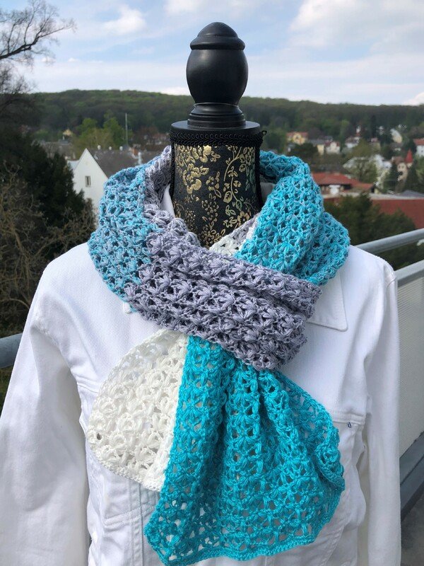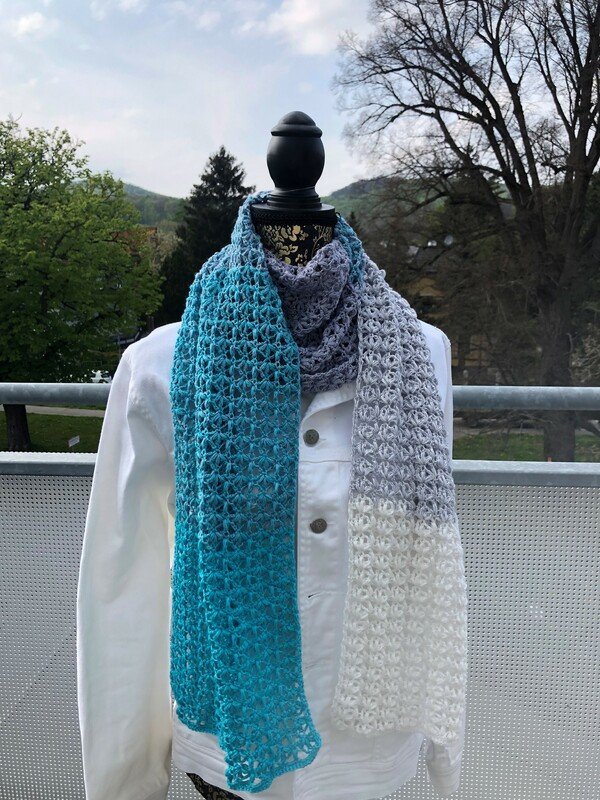Du kannst den Schal mit beliebigem Garn häkeln. Die benötigte Garnmenge ist abhängig von der Wunschgröße, dem gewählten Material und deinem persönlichen Häkelstil. Bei Farbverlaufsgarn empfehle ich je nach Häkelstil eine Lauflänge von 750 bis 1000 m 3-fädig. Für eine Stola solltest du entsprechend mehr Lauflänge einplanen.