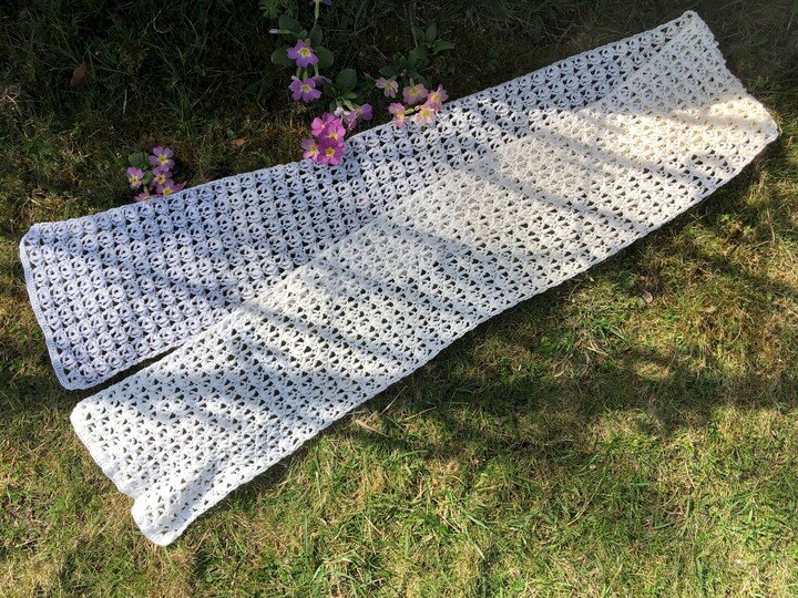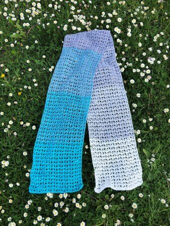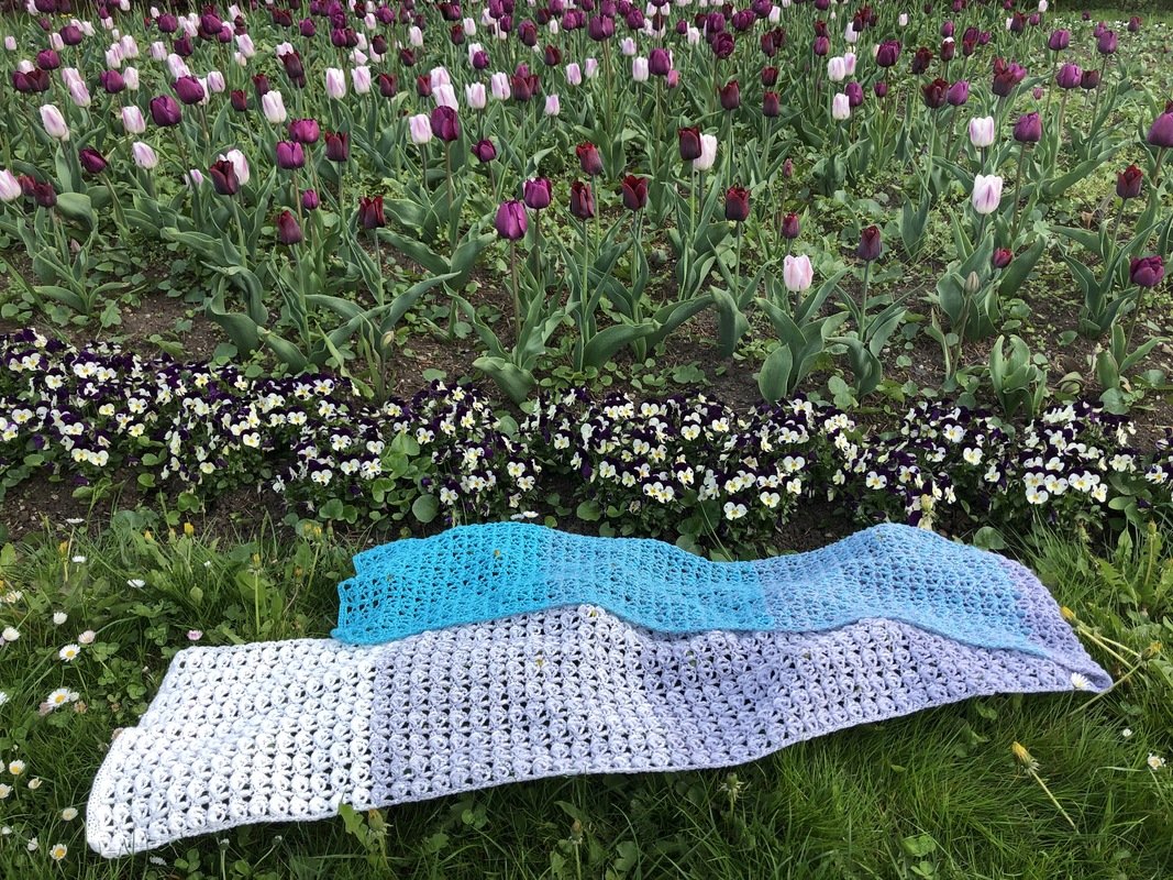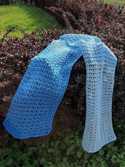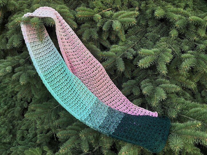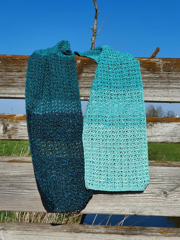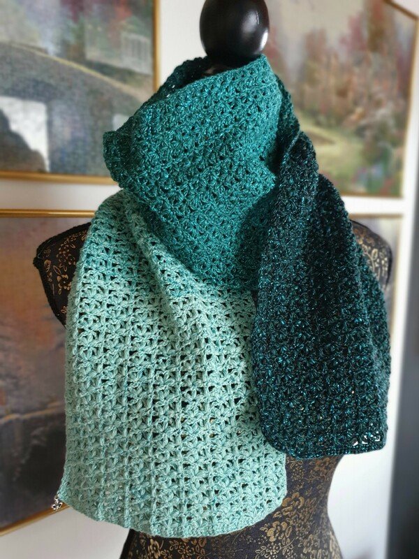 Du kannst den Schal mit beliebigem Garn häkeln. Die benötigte Garnmenge ist abhängig von der Wunschgröße, dem gewählten Material und deinem persönlichen Häkelstil. Bei Farbverlaufsgarn empfehle ich je nach Häkelstil eine Lauflänge von 750 bis 1000 m 3-fädig. Für eine Stola solltest du entsprechend mehr Lauflänge einplanen.