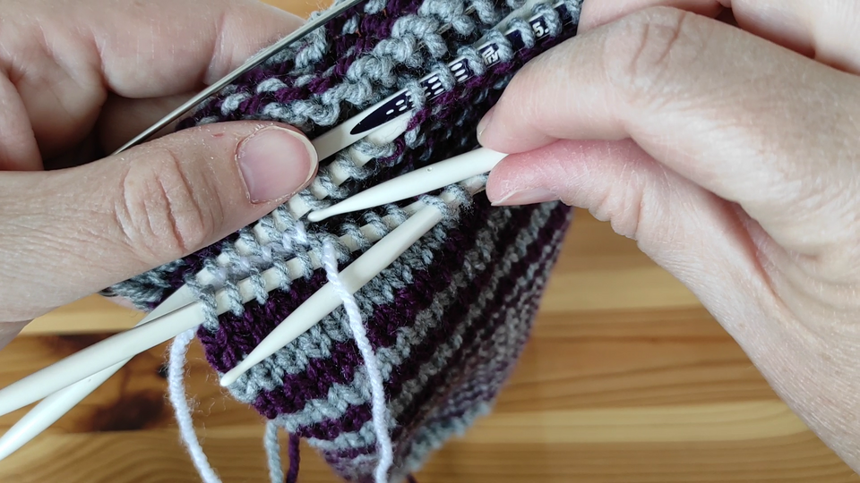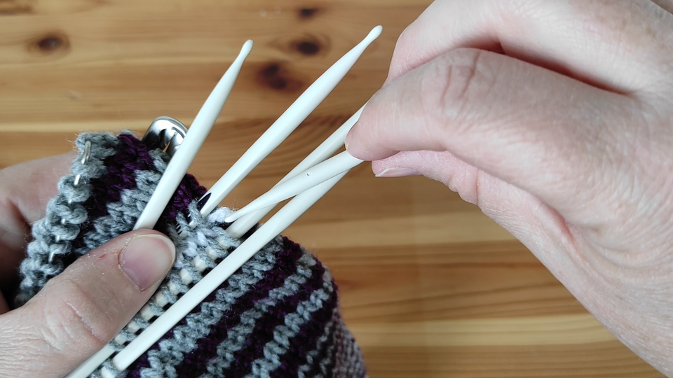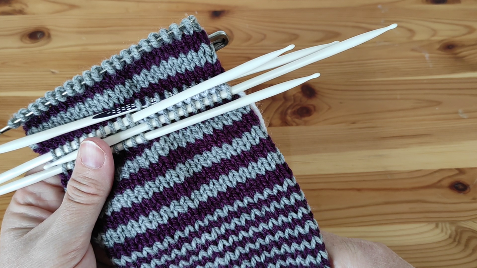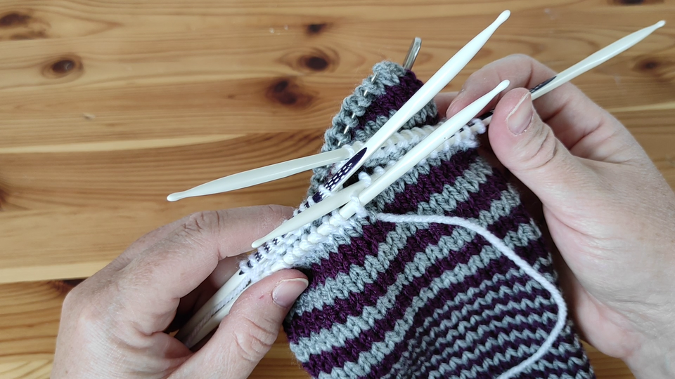 In diesem Videotutorial stelle ich Euch die Technik der nachträglichen Ferse beim Sockenstricken vor. Die Socke wird dabei vom Bündchen bis zur Spitze als Schlauch gestrickt, anstelle der Ferse wird ein Hilfsfaden eingezogen. Durch Herauslösens des Hilfsfadens werden die Maschen für die Ferse aufgenommen und diese dann analog zur Spitze gestrickt.
