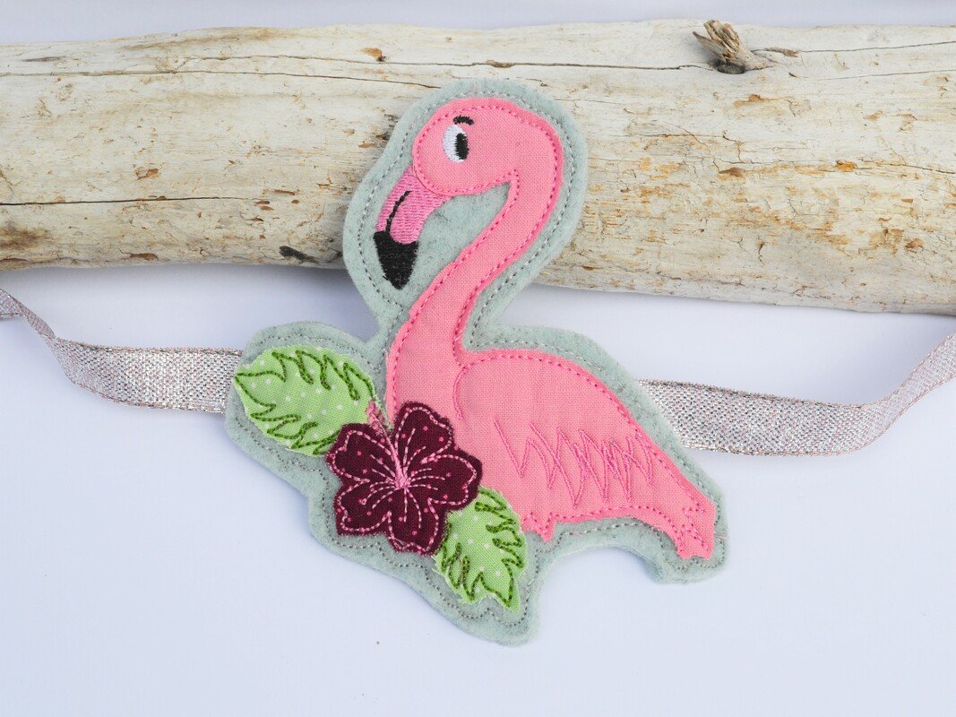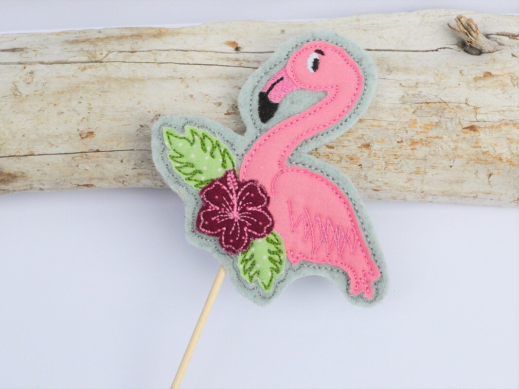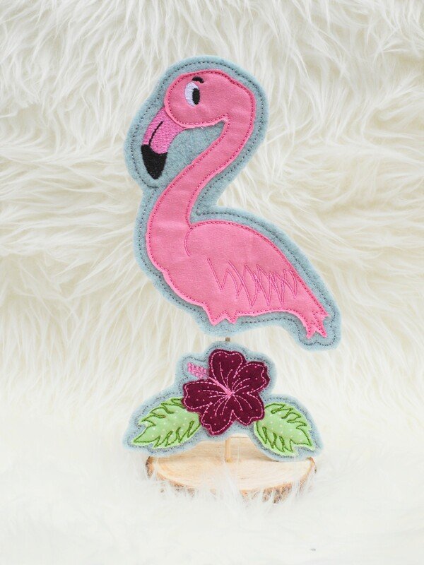 Der Flamingo kann hier in mehreren Varianten gestickt werden. Je nachdem welche Variante man wählt, ist die Öffnung für einen Stab oder Geschenkband an einer anderen Stelle.