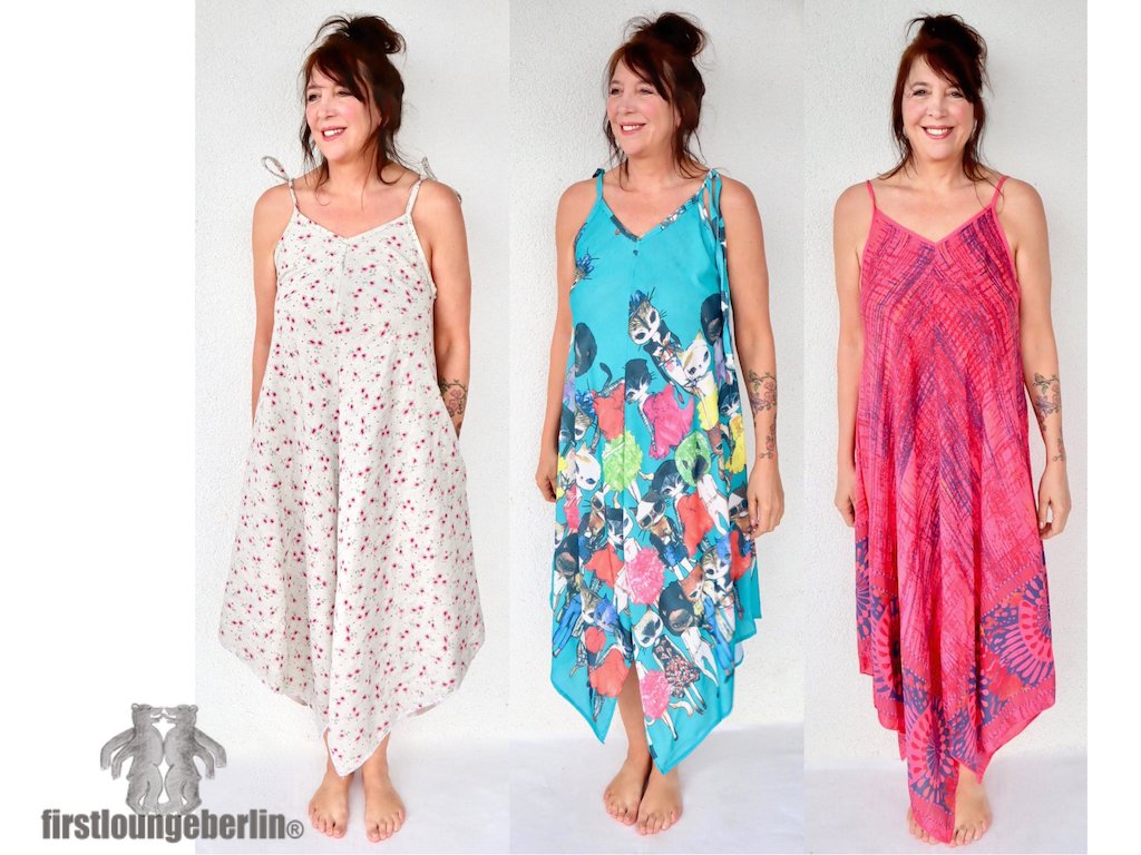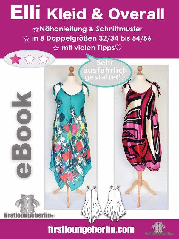 ♥♥ Elli ist ein tolles Sommerkleid. Mit einer Zusatznaht kann es auch fix zum Overall genäht werden. Auch hier können Seitentaschen eingenäht werden. In der Länge kann Elli sowohl verlängert wie auch gekürzt werden. Dazu gibt es auch Anpassungs-Tipps hier im eBook Mit selbst genähtem Bindeband kann das Kleid super individuell am Ausschnitt angepasst werden. Es kann mit einem ganz einfachen Zickzackstich versäubert werden oder auch mit 3- oder 4- Faden-Overlock genäht werden. Hier kann ein Rollsaum genauso wie eine Umschlagkante vernäht werden. Wenn es das Material zulässt kann auch einfach nur mit einem Geradstich alles genäht werden. Die Anleitung ist wie bei allen firstloungeberlin eBooks sehr ausführlich in Bild und Schrift und ganz ehrlich Schritt für Schritt erklärt. Anfänger können nach einer vollständigen Nähprobe sich ihren Lieblings-Sommerlook gestalten, anpassen, ändern und dann ganz einfach nachnähen.♥♥