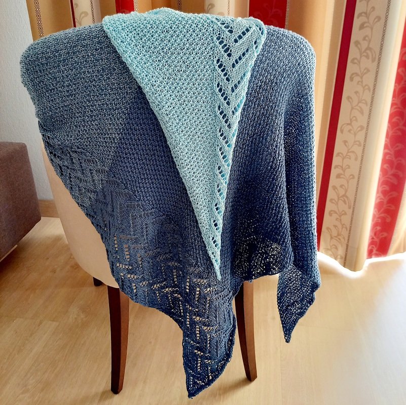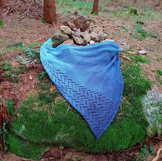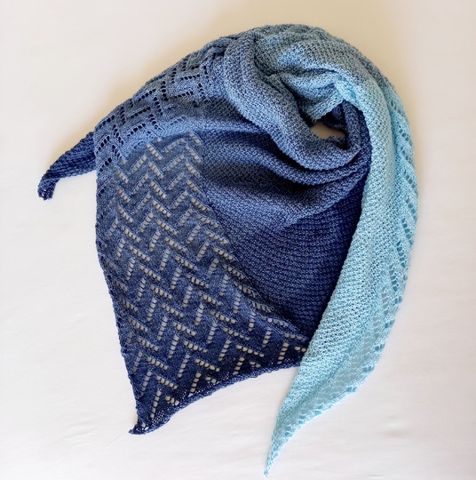 Das asymmetrische Dreiecktuch "Mariella" wird in einer Kombination aus Lace- und Perlmuster gestrickt, wobei der Lace-Teil nach und nach breiter wird.
