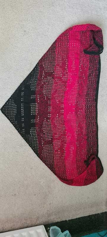 Das Tuch ist 240 cm auf 85 cm. Je nach dem wie fest oder locker gehäkelt wird.