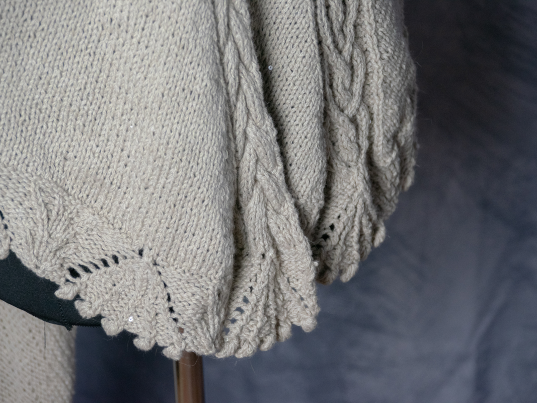 Das Tuch wird an der Borte begonnen und dann nach oben mit Abnahmen weitergearbeitet. Die ersten Reihen sind lang, aber werden mit der Zeit immer kürzer. So zieht sich das Projekt nicht, weil man immer schneller die Reihen beendet.