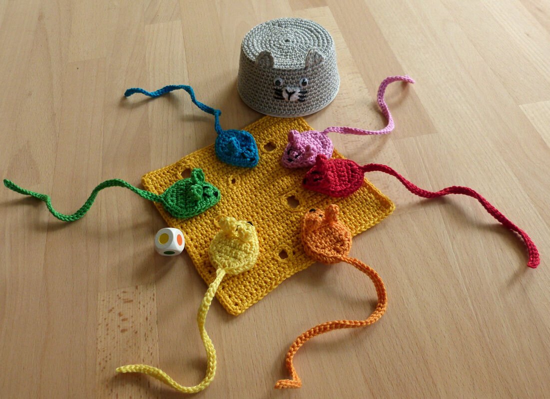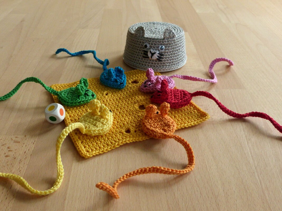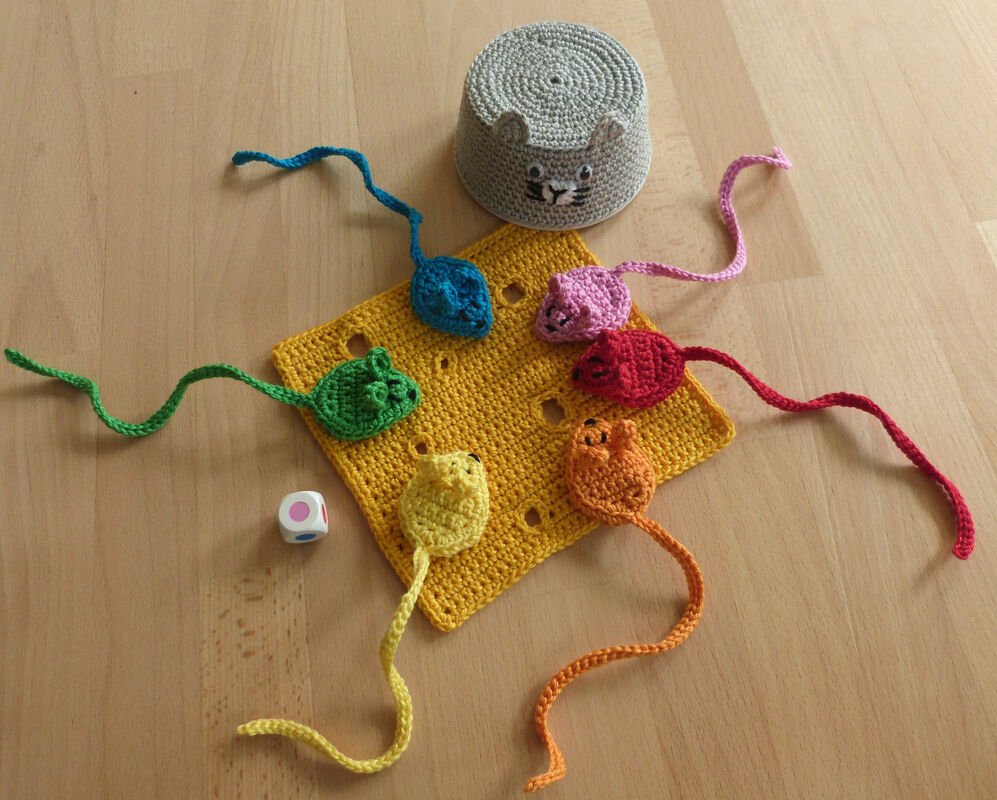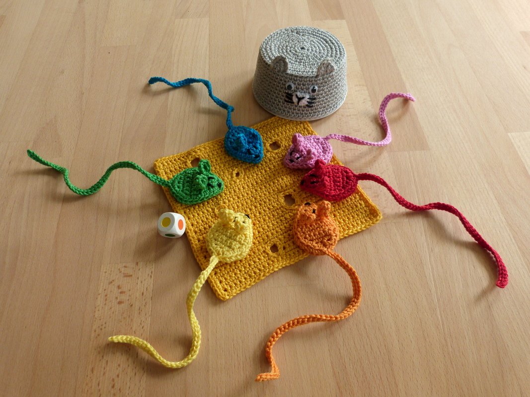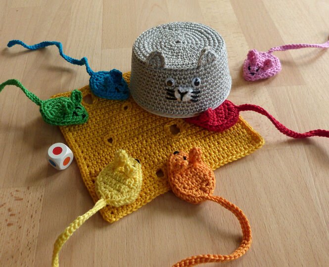 Bei Verwendung von Baumwollgarn mit einer Lauflänge von 125m/50g und Nadelstärke 3 wird das Spielfeld etwa 14 x 14 cm groß und die Mäuse werden ca. 4,5 cm lang (ohne Schwanz gemessen).