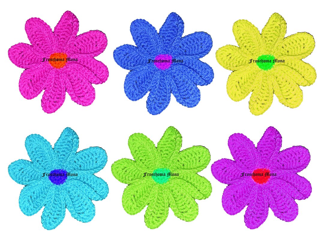 Eine Häkelschrift ist enthalten, in der die Runden der Blütenblätter in verschiedenen Farben abgebildet sind.