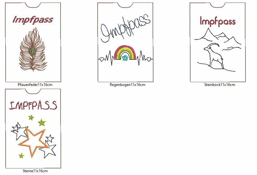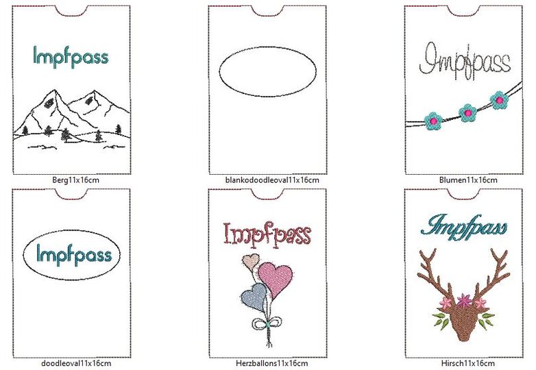 alle Motive sin in 2erlei Größen enthalten:für 16x11cm und 10x13,5cm Impfpasshüllen