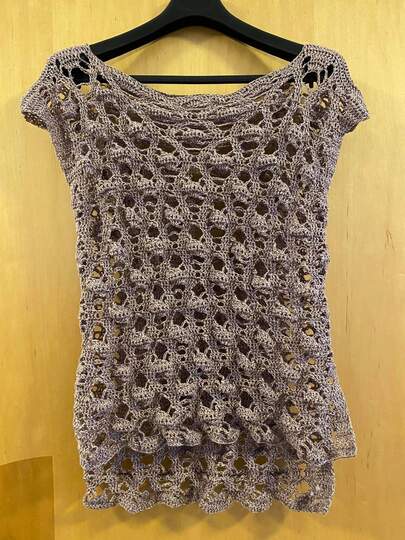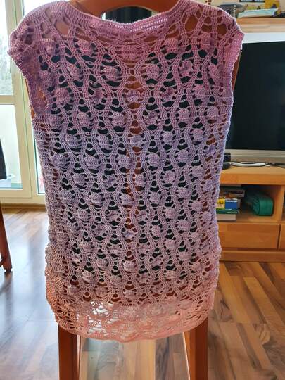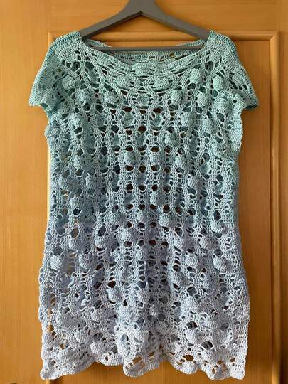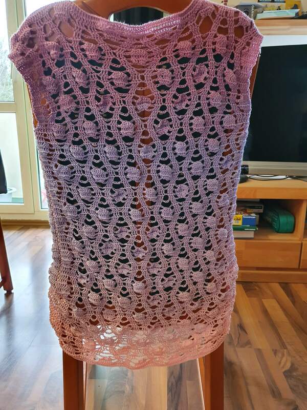 Ich habe für Konfektionsgröße 36 1000m eines Farbverlaufgarns benötigt. Damit ist meine Tunika recht weit geworden, weil ich etwas locker luftiges für den Sommer haben wollte.
