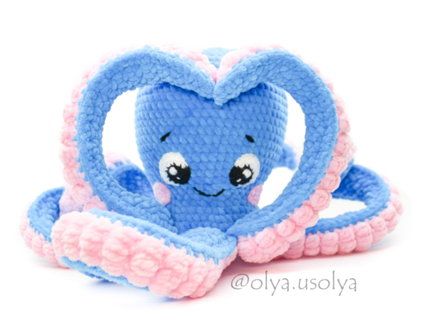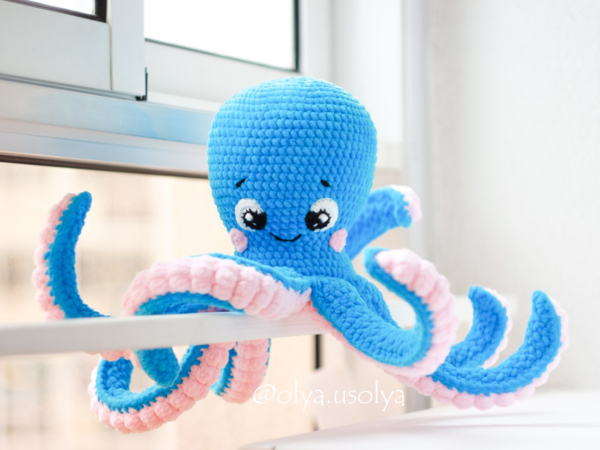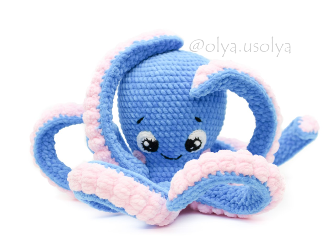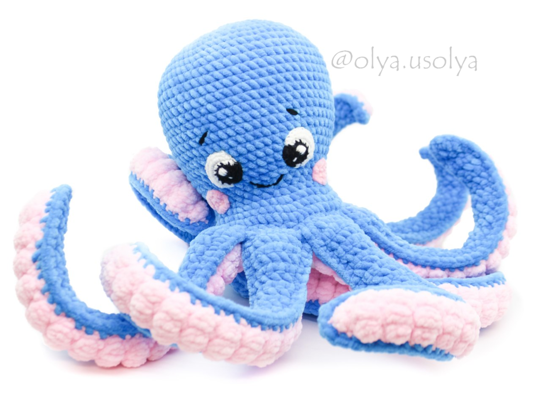 Mit diesem Häkelmuster können Sie ein Tintenfisch Ostin nach dem Originalmuster von Olya Usolya aus Plüschgarn häkeln.