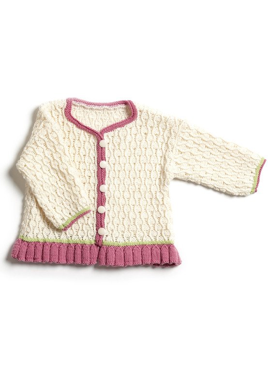 Lana Grossa „Cool Wool Baby“ (100% Schurwolle, LL ca 220 m/50 g): Jacke: ca 150 (150-150-200) g Creme Fb 213, 50 (50-100-100) g Erika Fb 242, 50 g Apfelgrün Fb 228 KnitPro-Stricknd Nr 2,5, KnitPro-Rundstricknd Nr 2,5, 60 cm lang 5 Knöpfe von Jim Knopf, Weiß Fb 02, Art Nr 11650, 15 mm Ø. Kleid: ca 100 g Creme Fb 213, 50 g Erika Fb 242, 50 g Apfelgrün Fb 228 KnitPro-Stricknd Nr 2,5 KnitPro-Häkelnd Nr 2 2 Blütenknöpfe von Jim Knopf, Art Nr 13007, Pink Fb 08, 24 mm Ø. Schuhe: ca 50 g Creme Fb 213, 50 g Erika Fb 242, 50 g Apfelgrün Fb 228 KnitPro-Stricknd Nr 2,5 KnitPro-Häkelnd Nr 2 2 Blütenknöpfe von Jim Knopf, Art Nr 13007, Pink Fb 08, 24 mm Ø.