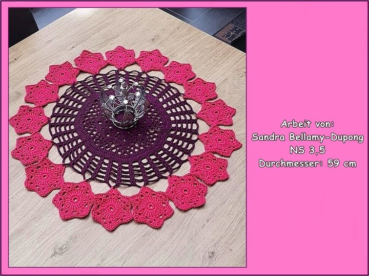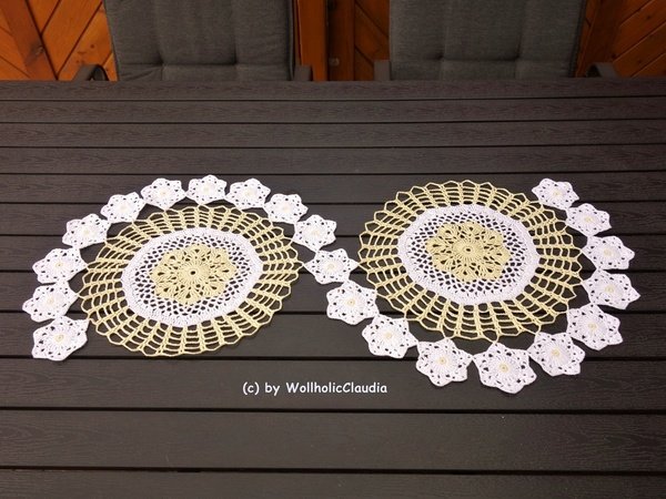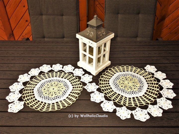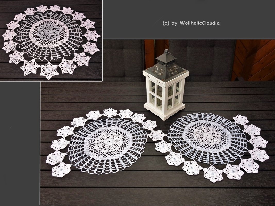 Du kannst sie unterschiedlich gestalten, wie abgebildet als Spiralläufer oder auch als rundes Deckchen. Du kannst sie mit jedem beliebigen Garn und der dazupassenden Nadelstärke anfertigen, ediglich die Größe variiert dementsprechend. Toll auch für die Garnresteverwertung.