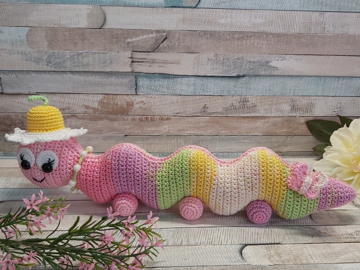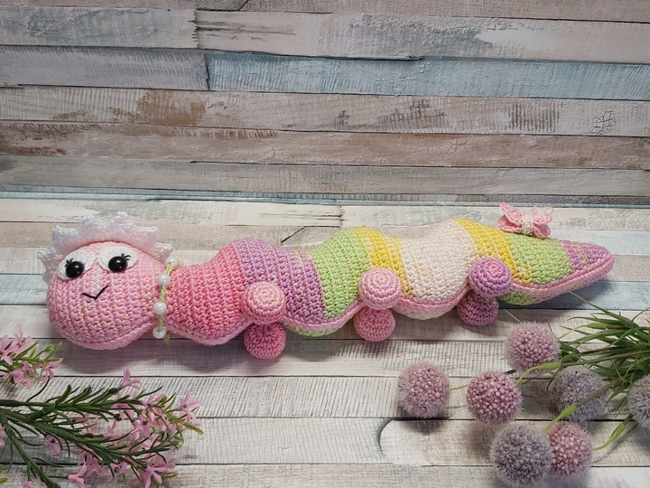 Die Raupe wurde mit Rellana Adina Batik Nr. 210 (100g-230m) und einer 2,5 Nadel gehäkelt.