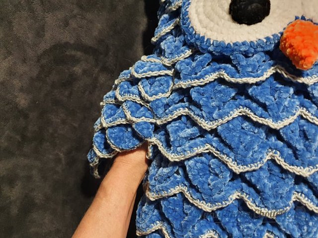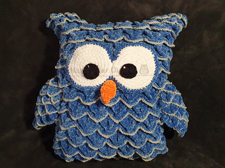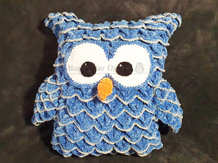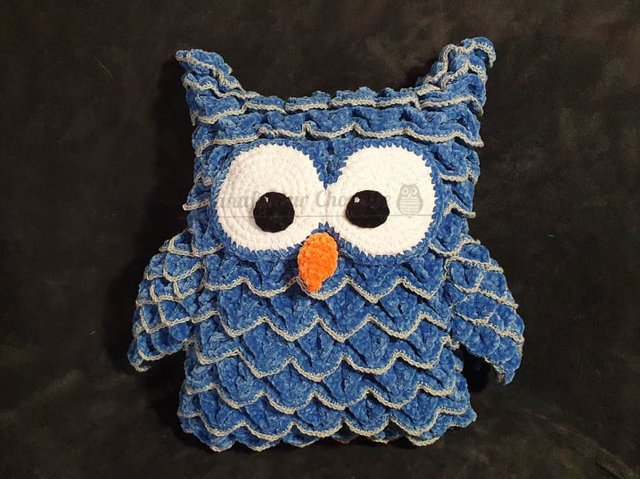 25 Seiten ausführliche schriftliche Häkelanleitung mit 86 Fotos für ein Eulenkissen aus Chenille-Garn