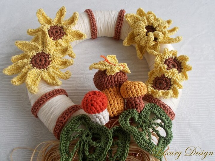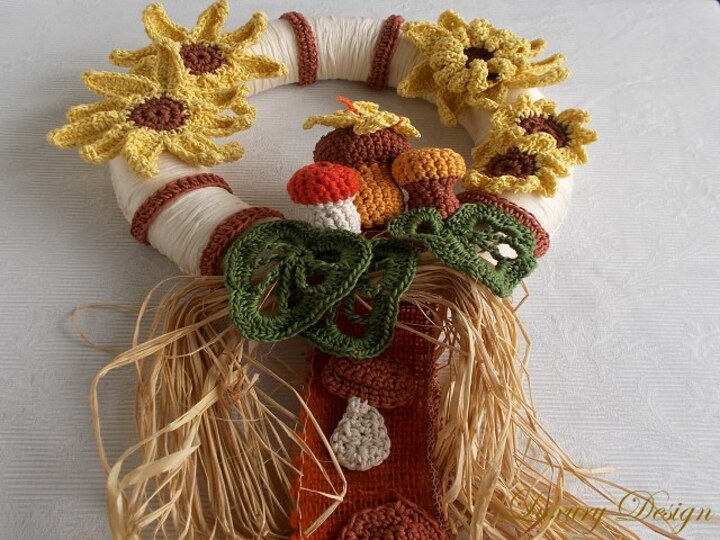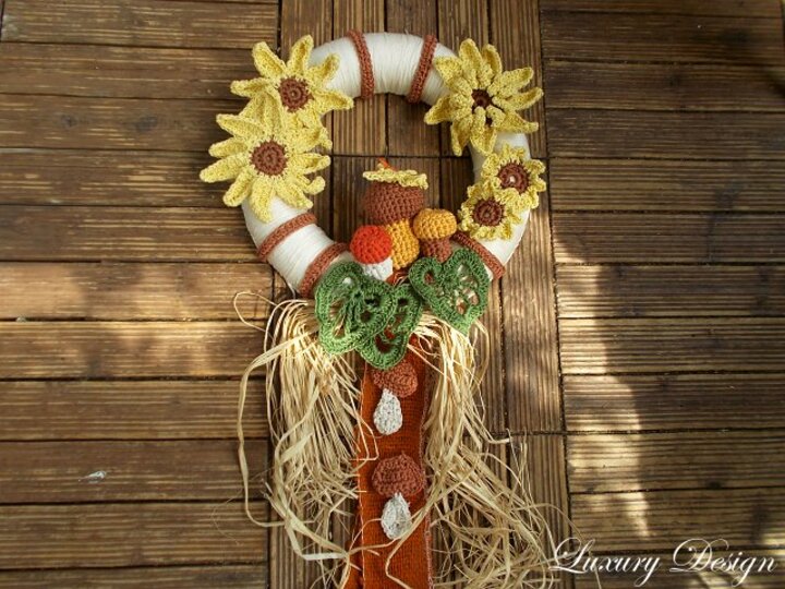 Ein schöner Türkranz für den Sommer und Herbst.Das Gelb der Sonnenblumen steht hier im Vordergrund, abgerundet durch erdige Töne die einfach nur Wärme ausstrahlen.Ihre Gäste werden diesen Kranz ganz bestimmt genauso bezaubernd finden wie Sie selbst.