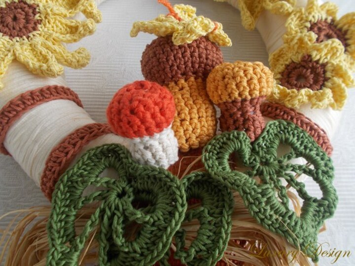 Wir benötigen Baumwolle mit einer LL von 125m in verschiedenen Farben ,Baumwollbändchen oder Stoffgarn Reste,eine Häkelnadel der Stärke 3,5 sowie einen Styroporkranz mit 32 cm Durchmesser,Juteband und Sisalschnur .