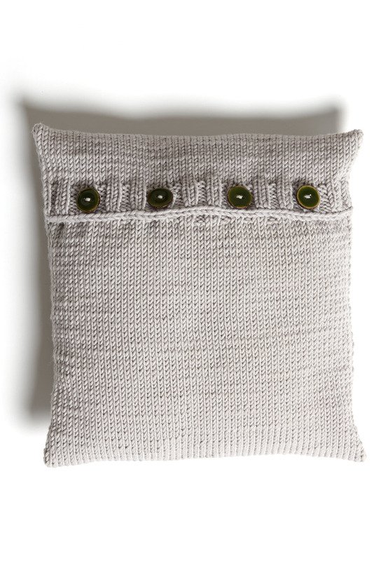 ONline „Linie 8 Starwool Maxi“ (100% Merinowolle, LL ca 80 m/50 g): ca 200 g Hellgrau Fb 40, je 50 g Hellgrün Fb 15, Dunkelgrün Fb 32, Wollweiß Fb 23 und Gelb Fb 41 Prym-Stricknd Nr 5,5 4 dunkelgrüne Knöpfe, 22 mm Ø, 1 Kisseninlett 30 x 30 cm.