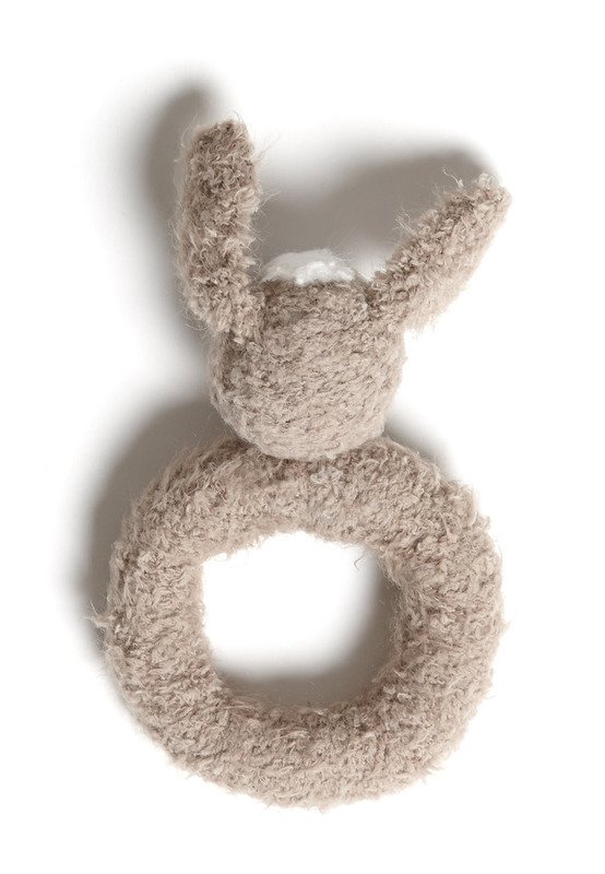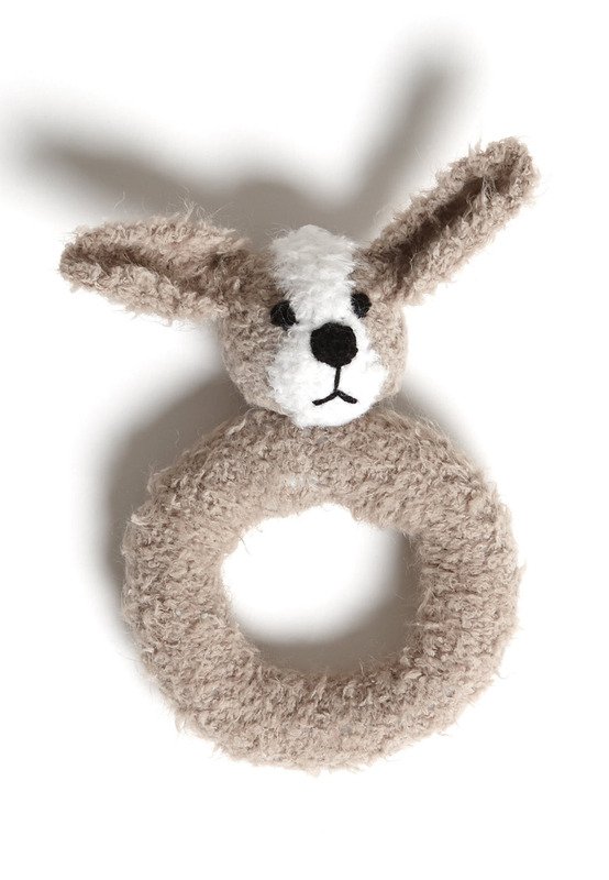 LANG YARNS „Doudou” (100% Polyamid, LL ca 155 m/50 g): ca 50 g Beige Fb 026 und einen Rest Weiß Fb 001 und „Merino 400 Lace” (100% Schurwolle, LL ca 200 m/25 g): einen Rest Schwarz Fb 004 addi-Nadelspiel Nr 3,5 rundes Glöckchen, ca 3 cm Ø, Füllwatte.