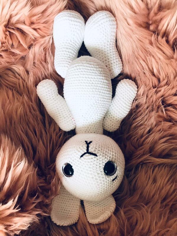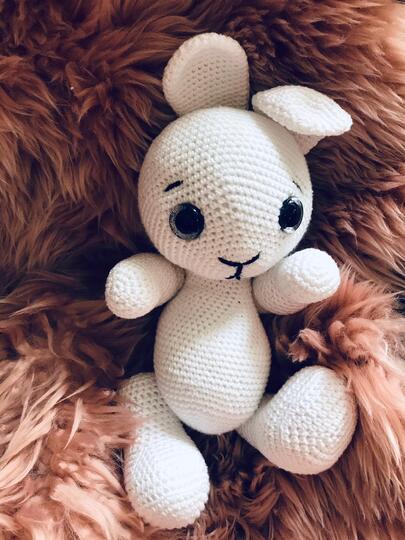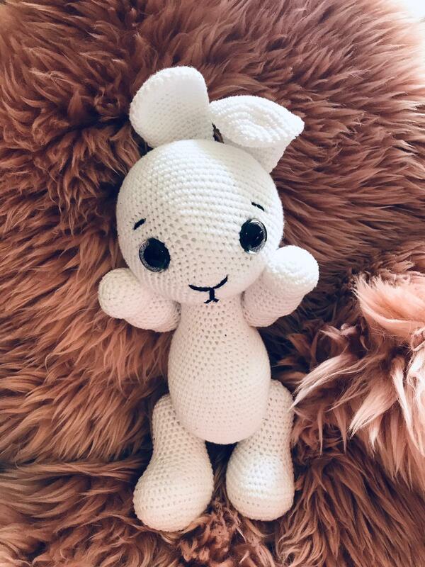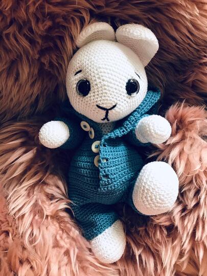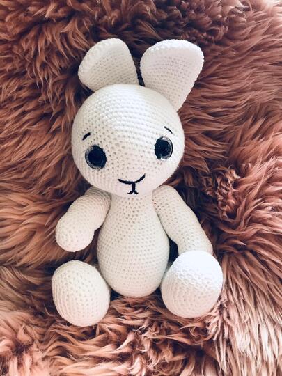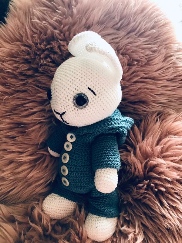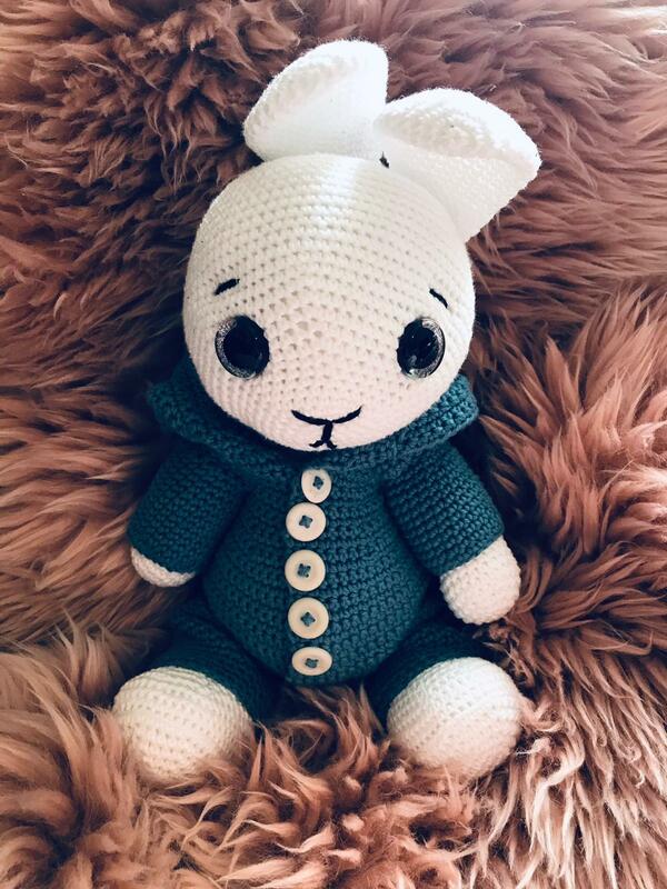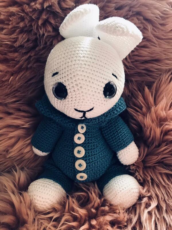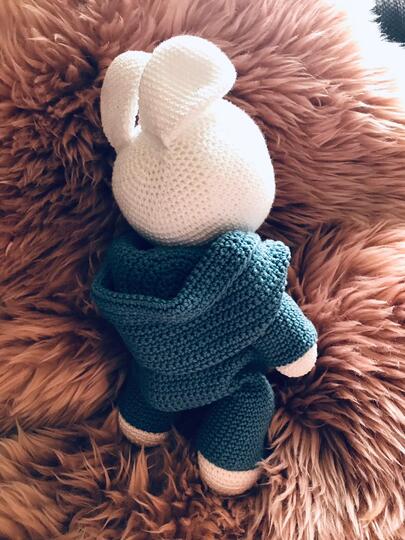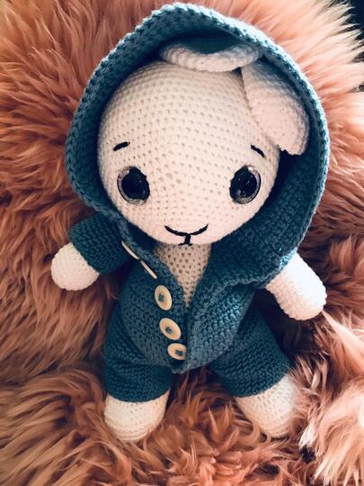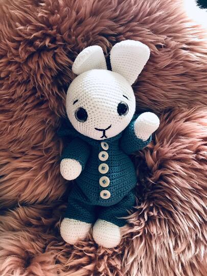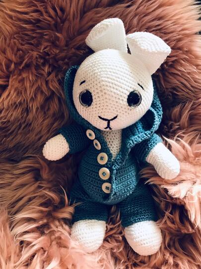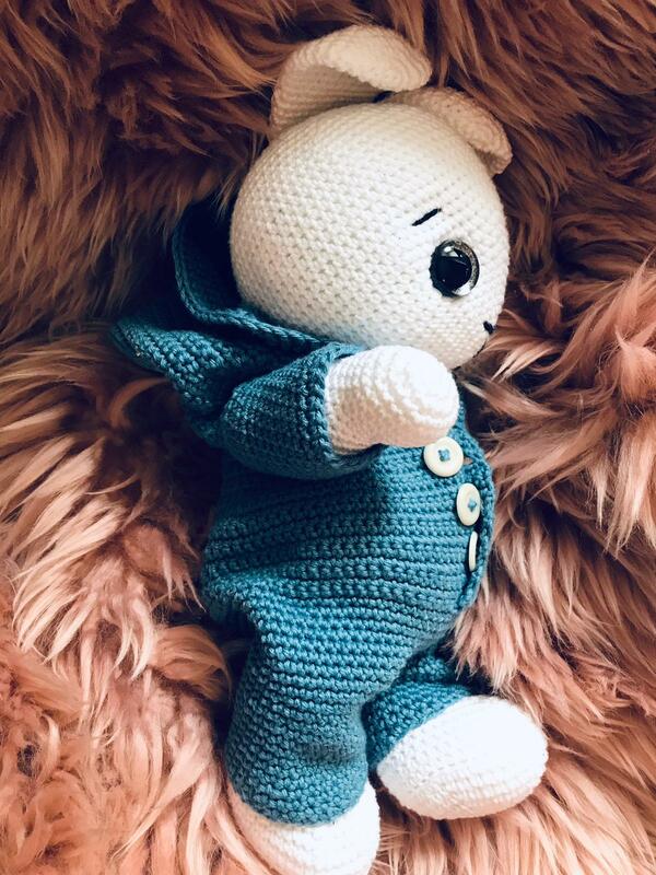 Häkelanleitung für einen süssen Hasen mit blauem Overall und beweglichen Gliedern. 12 Seiten, Schritt-für-Schritt Anleitung mit vielen Bildern