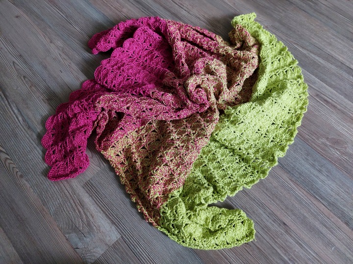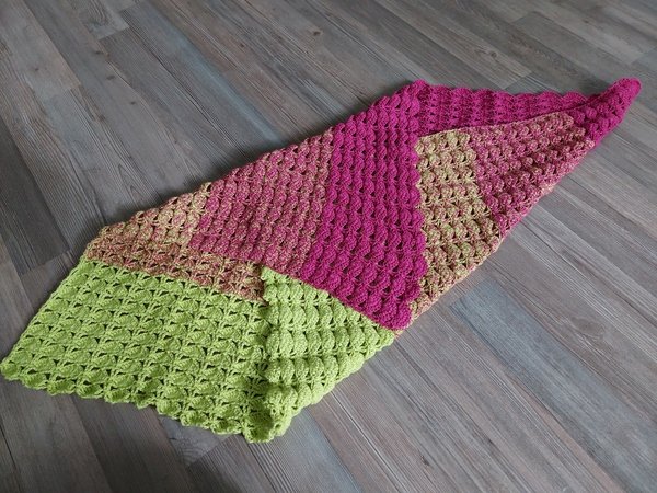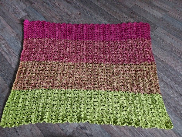 Ich habe diese Decke mit einem 3 fadigen Farbverlaufsbobbel mit einer Nadelstärke 3 gearbeitet. Somit kam ich auf eine Breite von ca 70 cm und einer Höhe von ca 59 cm.