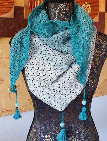 Du kannst das Tuch mit beliebigem Garn häkeln. Die benötigte Garnmenge ist abhängig von der Wunschgröße, dem gewählten Material und deinem persönlichen Häkelstil. Bei Farbverlaufsgarn empfehle ich eine Lauflänge von 1000-1300 m 3-fädig bzw. 4-fädig.