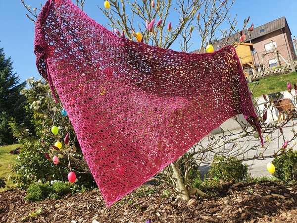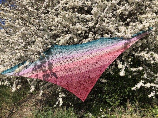 Das Tuch auf dem Titelbild wurde mit einem Bobbel Farbverlaufsgarn mit 1000 m, 3-fädig und Nadelstärke 3,25 angefertigt und misst ca. 208 x 79 cm.