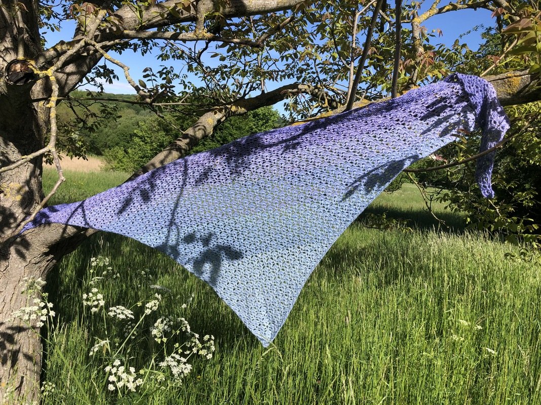 Breezy Blossom ist ein symmetrisches eher flaches Dreieckstuch mit einem effektvollen Muster, das von der Spitze weg Richtung Halskante gehäkelt wird. Wenn du das Tuch ausreichend groß arbeitest, kannst du es einmal falten, doppelt nehmen und erhältst dann eine diagonale Optik und ein kuscheliges Ergebnis. Ungefaltet hat das Tuch einen luftigeren Charakter.