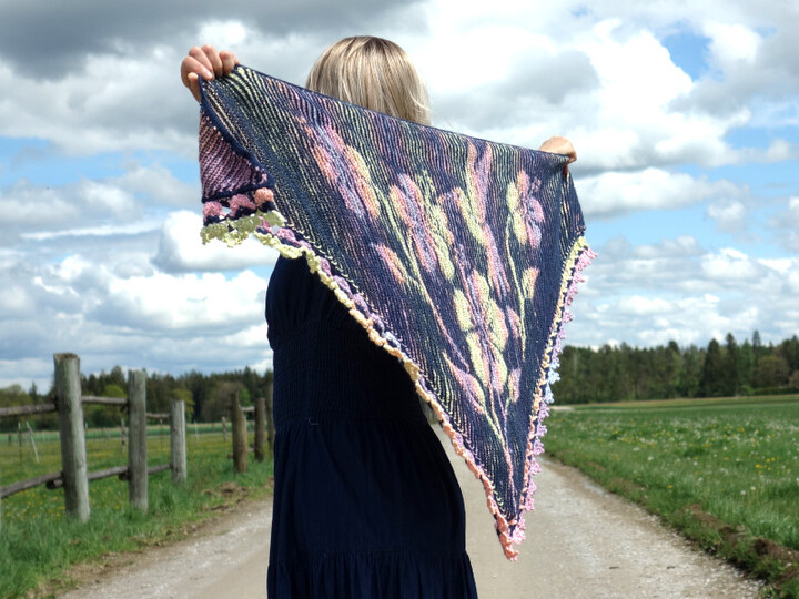 Dieses Dreieckstuch ist in der Technik Illusionsstricken gearbeitet.