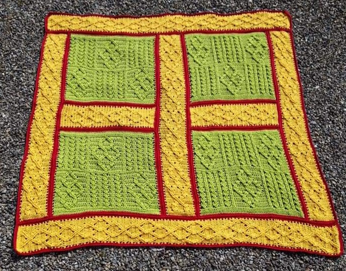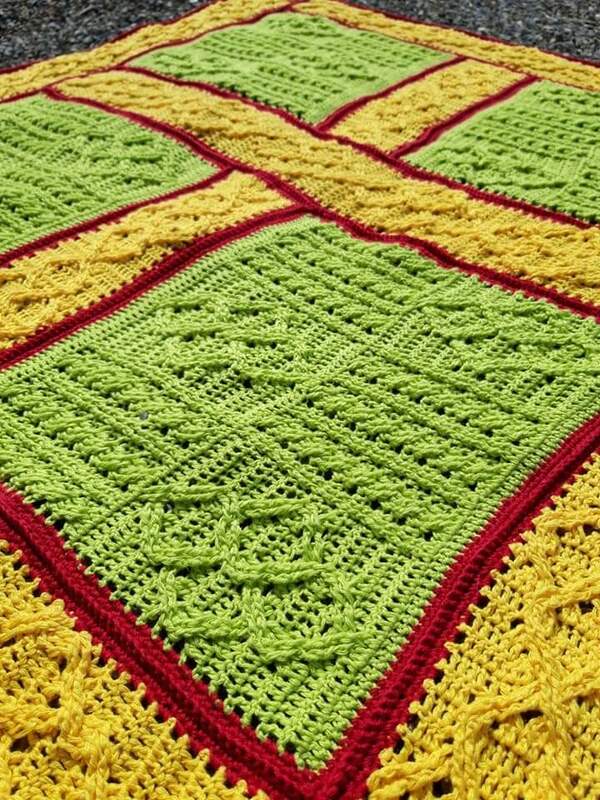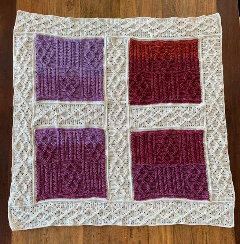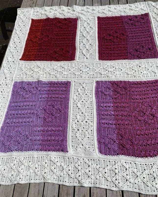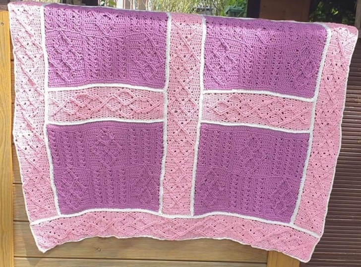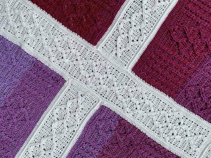 Die Babydecke wirkt wie ein Zopfmuster, wird aber nur mit überkreuzten Doppelreliefstäbchen gehäkelt
