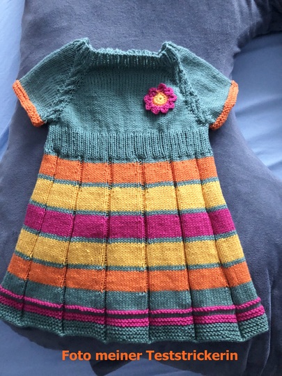 Das Kleidchen wird ohne Nähte mit Raglan von oben gestrickt. Die Raglanschräge hat ein hübsches Zopfmuster und die Farben können nach Wunsch auch anders kombiniert werden. Für erfahrene Stricker/innen lässt es sich schnell und einfach nachstricken.