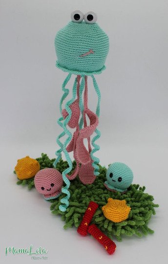 Mit dieser Häkelanleitung könnt ihr euch die im Artikelbild gezeigte Qualle samt den kleinen Oktis, dem Seegras und den Korallen zaubern.