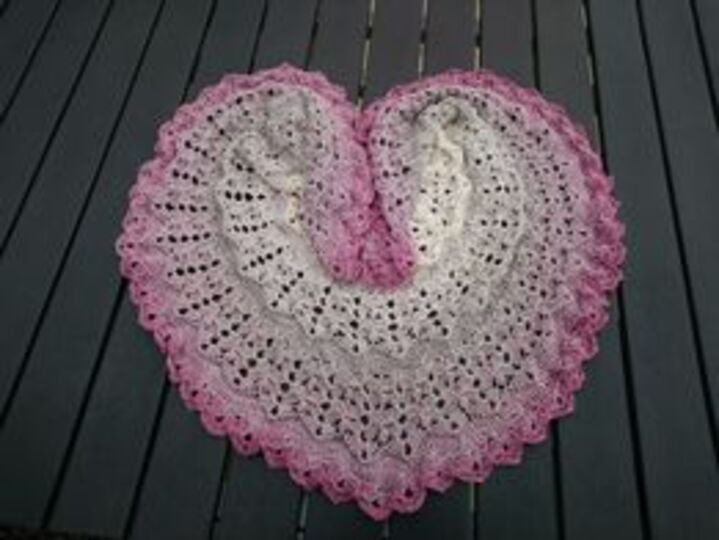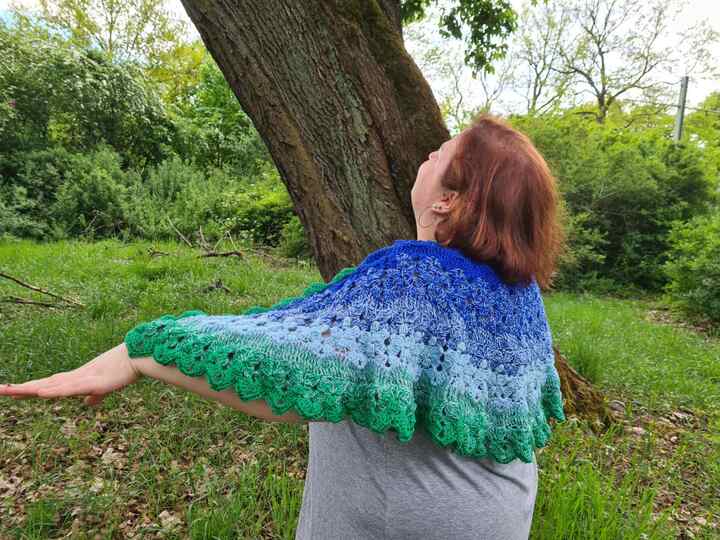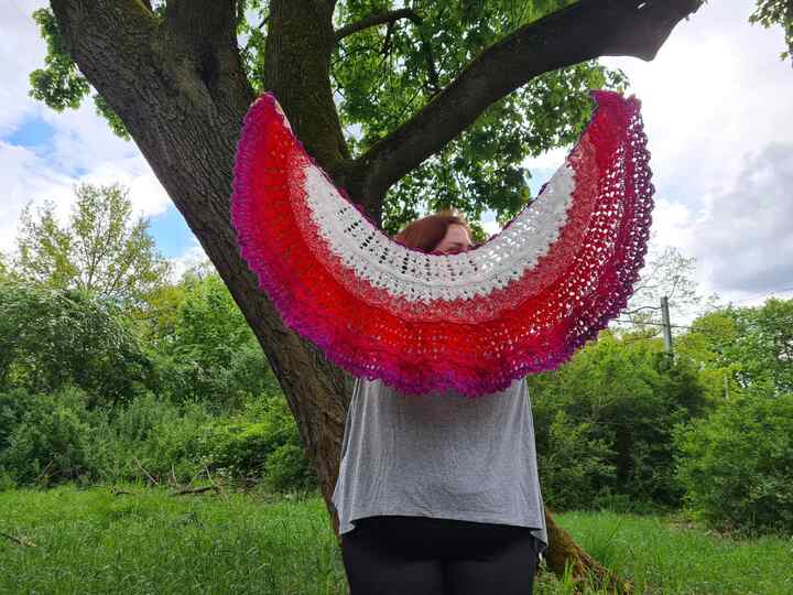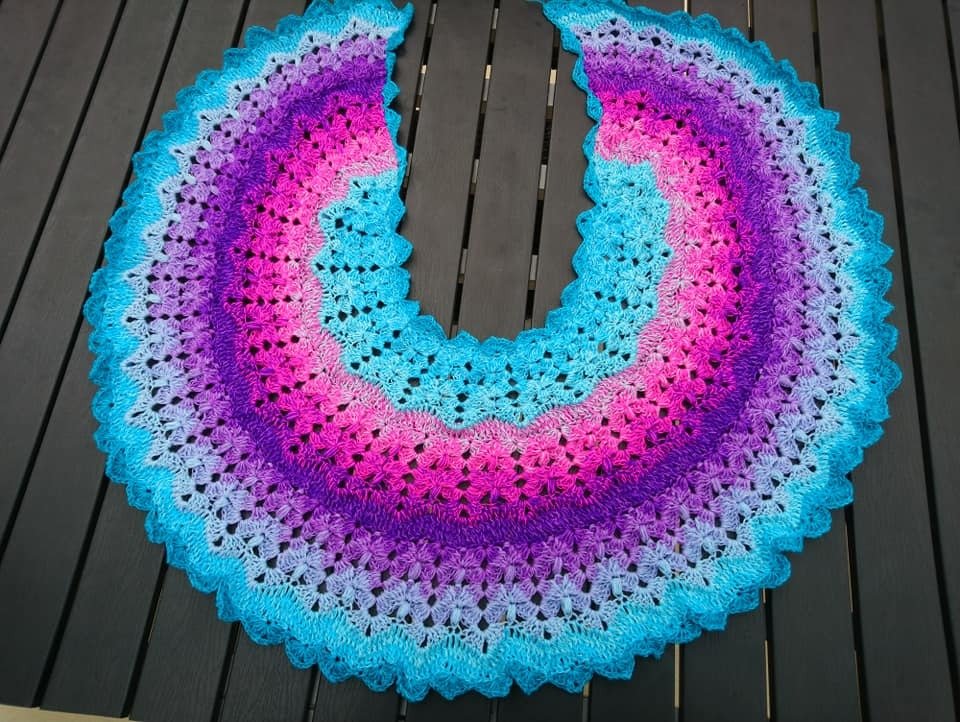 Die Schwesterfreude ist ein gehäkeltes, effektvoll und edel aussehendes, aber leicht zu häkelndes halbrundes Tuch bzw Schulterschmeichler.