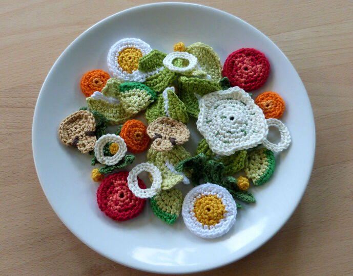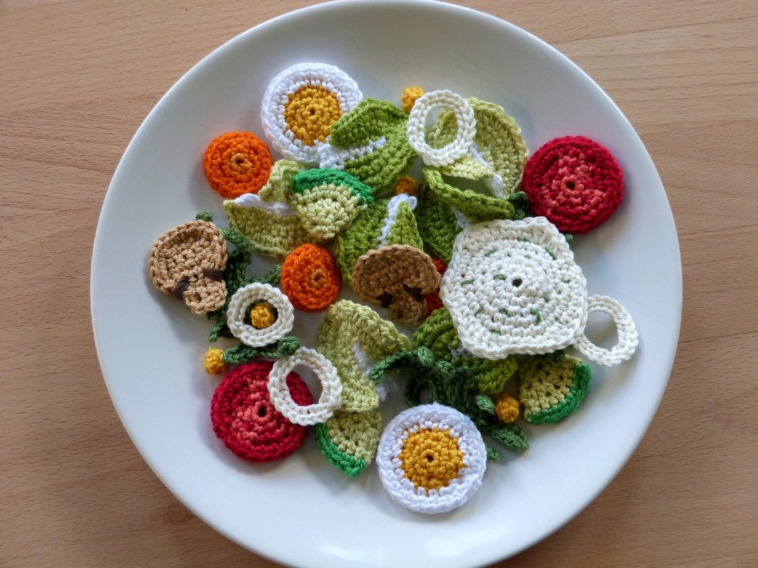 Mit Essen spielt man nicht? Hiermit schon! Häkel einen leckeren und gesunden Salatteller für die Kinderküche ganz einfach selbst! Auch als Deko für Küche oder Esszimmer geeignet!