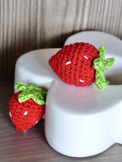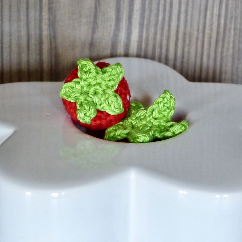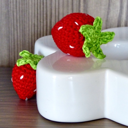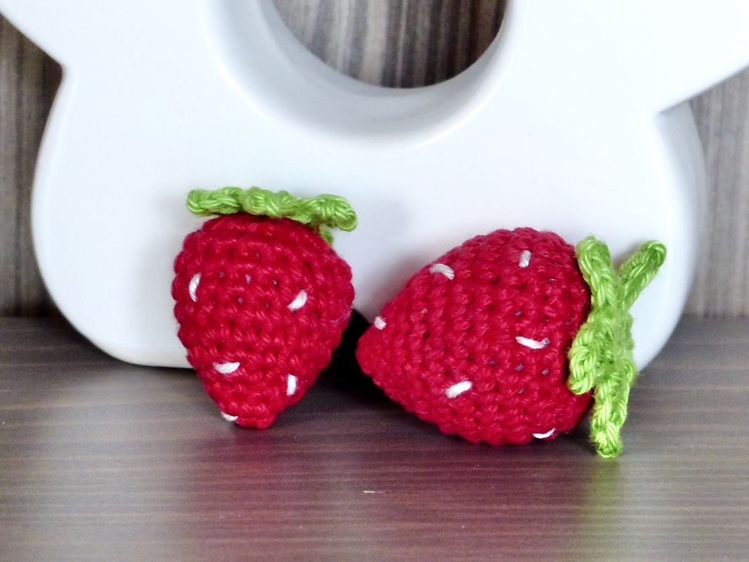 Mit dieser Häkelanleitung könnt ihr Erdbeeren in zwei Größen für die Kinderküche und den Kaufmannsladen häkeln oder euch damit eine sommerliche Deko in einer Schale oder auf einem Kranz schaffen. Auch als Geschenkanhänger oder als Deko auf einem Marmeladenglasbezug sind sie eine schöne Ergänzung.