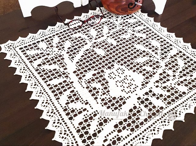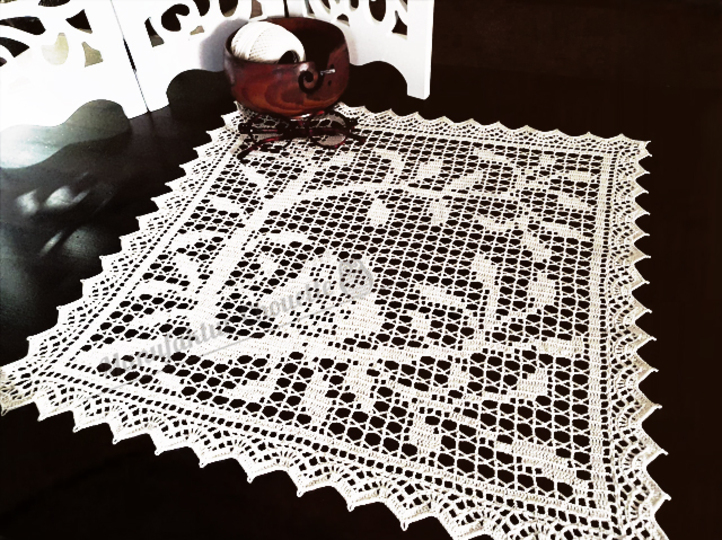 Die 21- seitige Anleitung enthält das Zählmuster für das Deckchen, das Schema für den Rand und eine ausführliche Beschreibung des Randes. Jede einzelne Reihe wird mit Text, vielen Fotos und Bildern erklärt, für alle, die keine Häkelschrift lesen können.