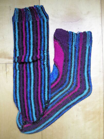 Anleitung zum Stricken der Socken "Regentag", längs gestrickt mit Streifen und verkürzten Reihen.