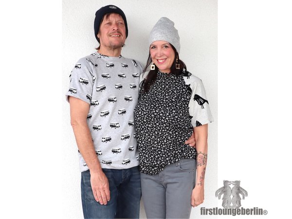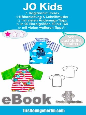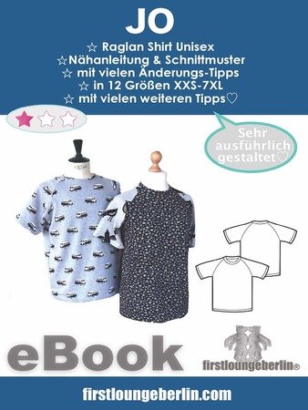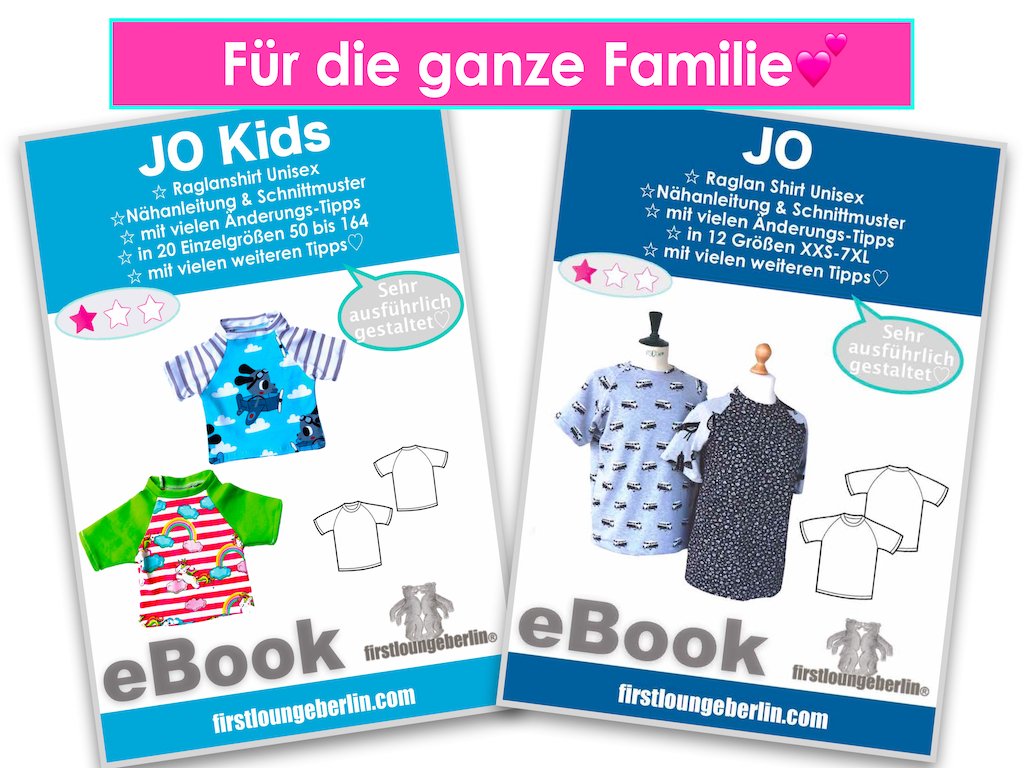 ♥♥ Nach dem Jo Shirt für Erwachsene und Jo Kids für Kinder gibt es jetzt alle Schnittmuster das Kombi-eBook für die ganze Familie. Die Nähanleitung ist die gleiche.. Jo ist ein schnell genähtes Raglanshirt. Anfänger können sich hier kreativ an Shirts für die ganze Familie austoben, Änderungen am Shirt vornehmen und das Shirt wirklich ganz einfach nachnähen. Hier ist nicht unbedingt eine Overlock nötig, auch mit einem ganz einfachen Zickzackstich kann versäubert werden. Wenn es das Material zulässt kann auch einfach nur mit einem Geradstich alles genäht werden. Die Anleitung ist wie bei allen firstloungeberlin eBooks sehr ausführlich in Bild und Schrift und ganz ehrlich Schritt für Schritt erklärt. Anfänger können nach einer vollständigen Nähprobe ihr Wunsch-Shirt gestalten, anpassen, ändern und dann ganz einfach nachnähen.♥♥