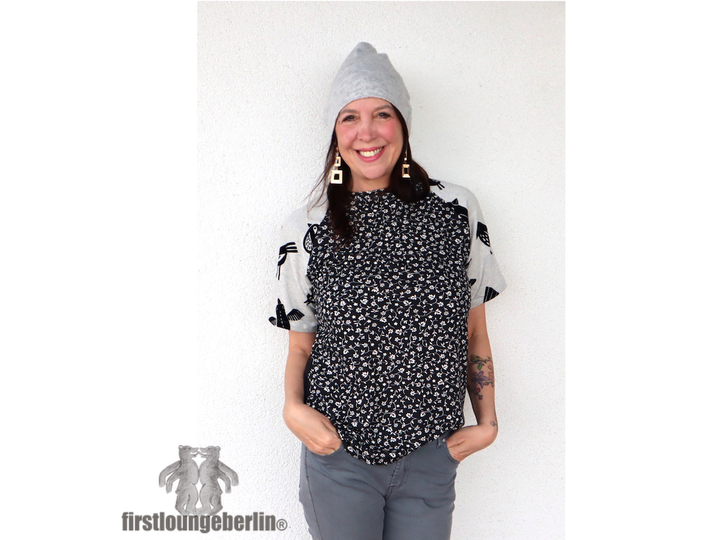 Tipp! Du kannst das Rück- oder Vorderteil auch aus einem nicht dehnbaren Stoff nähen. Hier ist es aus Spitze. Das geht natürlich auch mit jedem anderen nicht dehnbaren Stoff. Wichtig! Aber bitte nur eine Seite. Vorder- oder Rückteil. Die Ärmel sollten aus dehnbaren Stoffen sein.