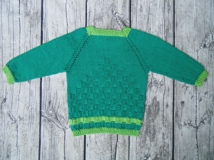 Der Pulli wird von oben nach unten gestrickt und sieht in jeder fröhlichen Farbe gut aus. Am Besten allerdings in grün.