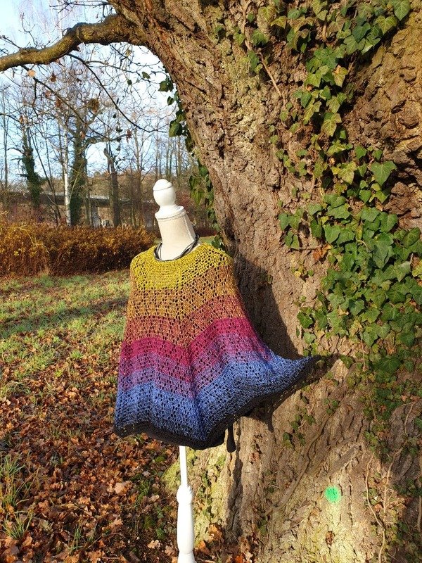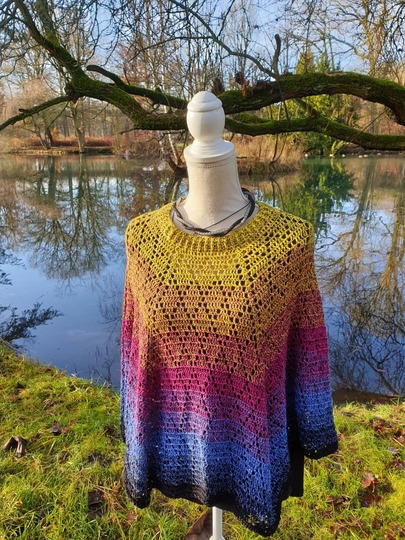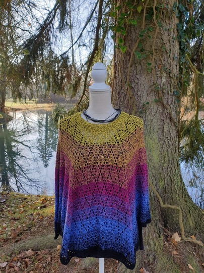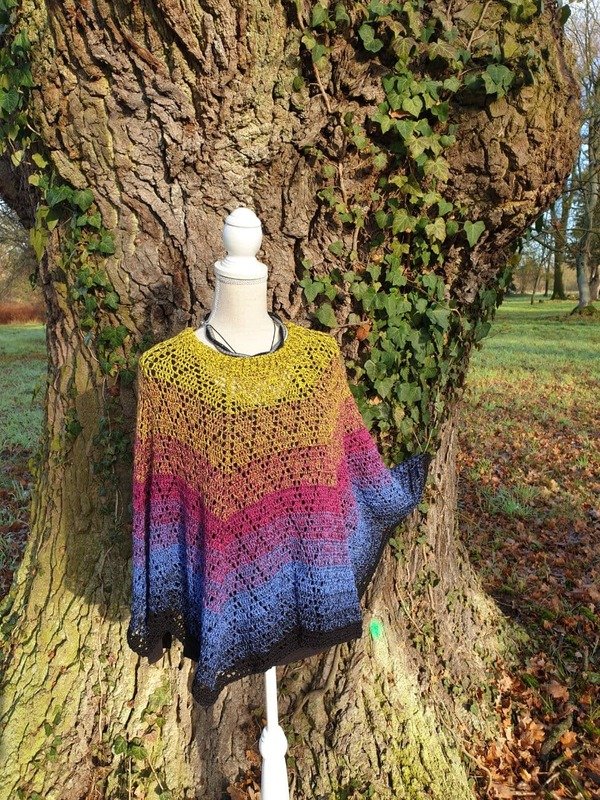 Was du bekommst: Anleitung in Schriftform, als Häkelschrift, 3 Seiten Angaben von Probehäklern. Anweisungen, das Tuch in einen Poncho umzuwandeln.