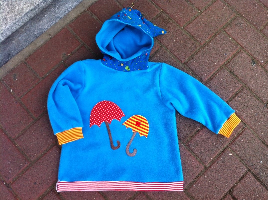 Die Passform ist lässig in A-Form und kann verschieden variiert werden. Durch zwei unterschiedliche Kapuzenformen oder auch einem Stegkragen entsteht immer wieder ein neues Lieblingsstück. Der Halsausschnitt ist angenehm weit, so dass der Pulli mühelos an- und ausgezogen werden kann. Der Kapuzenschnitt sorgt dafür, dass der Hals trotzdem schön "eingepackt" ist.