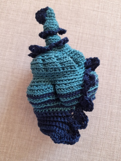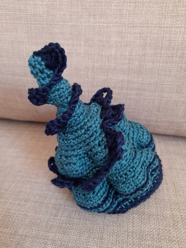 Kjell wird ca. 10 cm groß, sein Muschel-Häuschen wird stehend ca. 14 cm hoch. Mit der Kante hat es eine Länge von ca. 16 cm.
