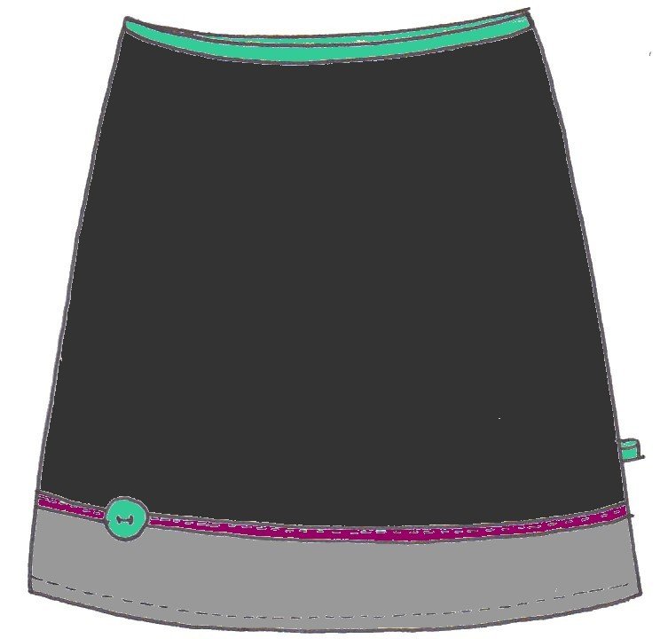 der Rock kommt ganz ohne Reißverschluss aus. Er sitzt hüftig und wird einfach über den Kopf gezogen. Das Schnittmuster umfasst sowohl eine gerade Rockform als auch eine leicht ausgestellte A-Linie. Ganz nach Geschmack kann er auch gekürzt oder verlängert werden. Der Grundschnitt ist bei einer Körpergröße von 1,75m ca. knielang.