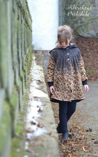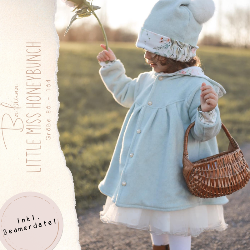 Mit meinen Schnittmustern erhältst du eine ausführlich bebilderte Schritt für Schritt Anleitung, die mit Näherfahrung gut zu meistern ist. Bei diesem Schnitt handelt es sich um den Mantel Little Miss Honeybunch in den Größen 86 – 164. Dieser Mantel ist in einer A-Linie geschnitten an der Vorder- und Rückseite mit Falten versehen. Der Mantel ist großzügig geschnitten damit darunter auch noch ein dicker Pullover Platz hat. Optional kannst du Ihn mit einer Knopfleiste oder einen Reißverschluss nähen.